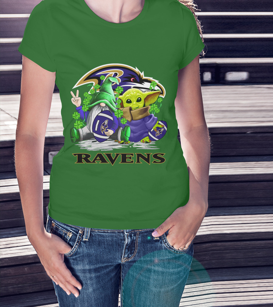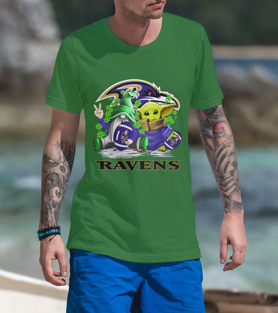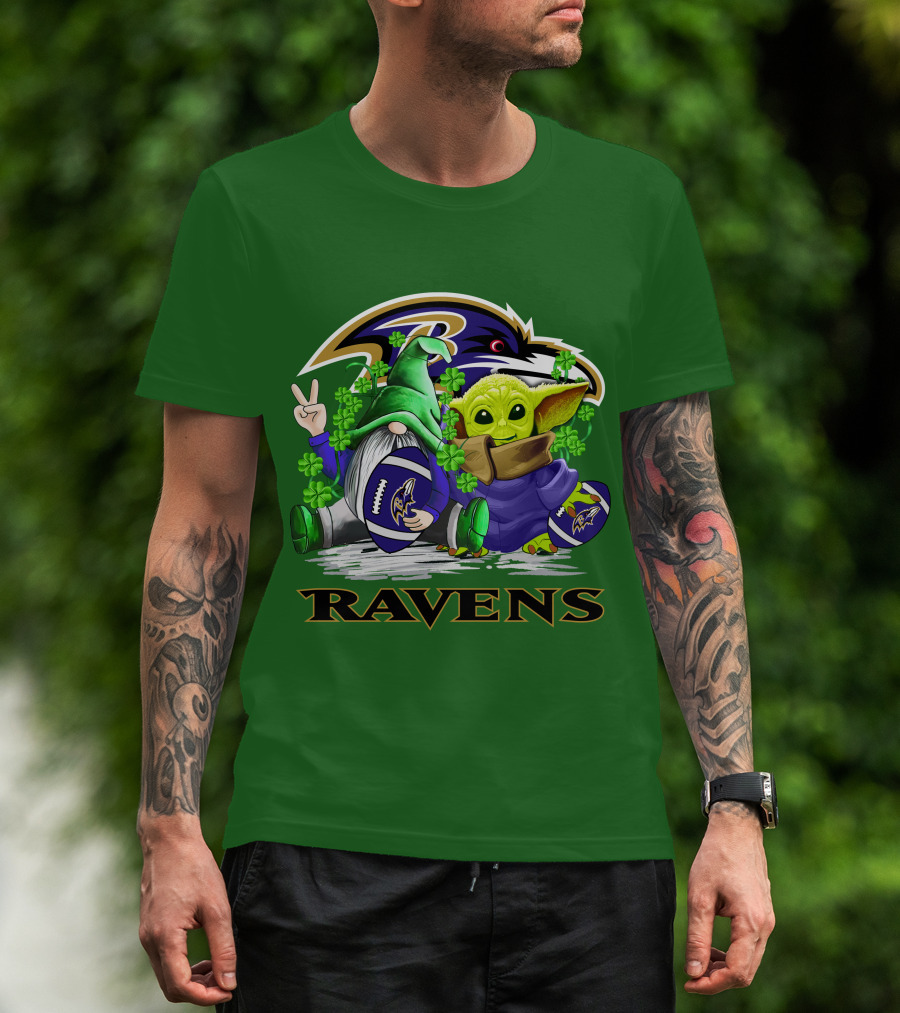 The Baltimore Ravens St. Patrick's Day Football Gnome and Baby Alien with Shamrocks T-shirt is designed for everyday wear and a consistent fit. Fabric is pre-shrunk ring-spun cotton with durable stitching. See the size chart below for exact measurements.