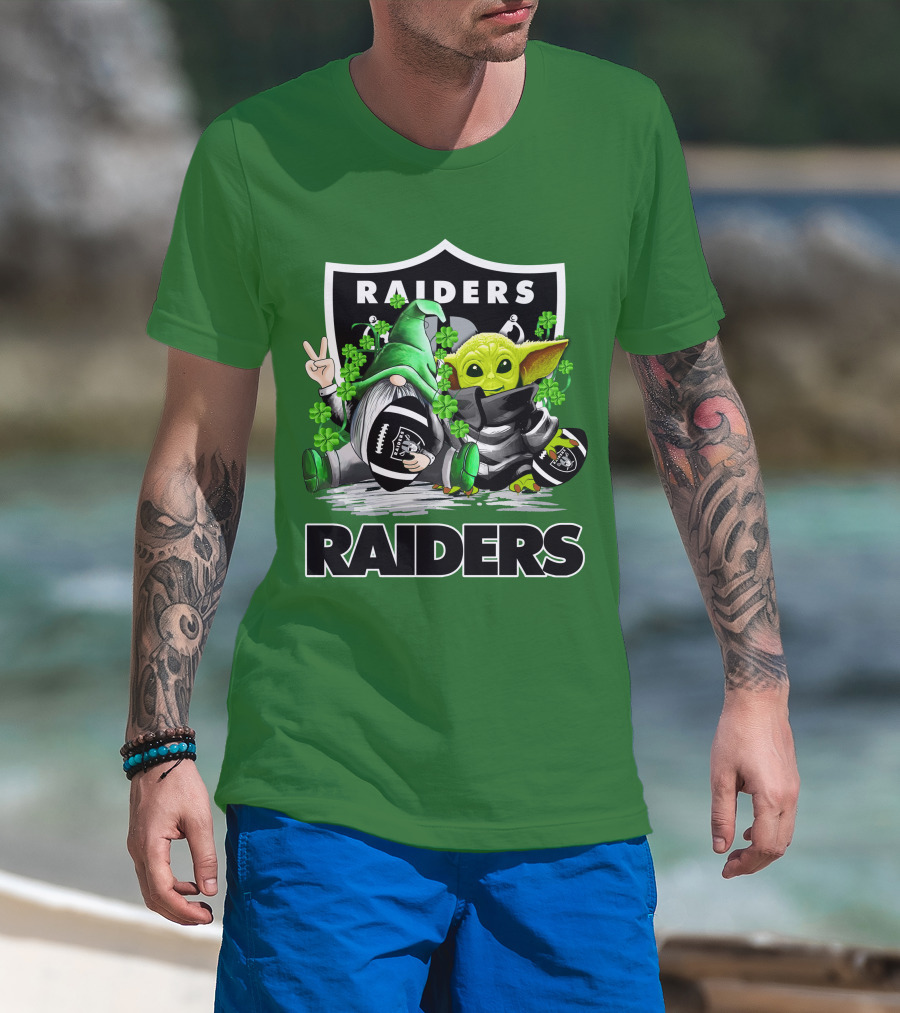 Raiders St. Patrick’s Day Football Gnome And Baby Alien With Clover Footballs T-Shirt