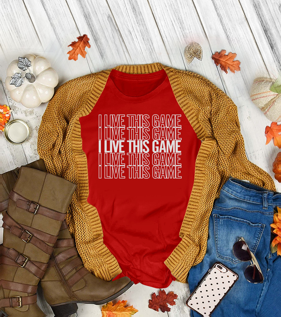The I Live This Game Bold Red Repeated Text T-shirt is designed for everyday wear and a consistent fit. Fabric is pre-shrunk ring-spun cotton with durable stitching. See the size chart below for exact measurements.