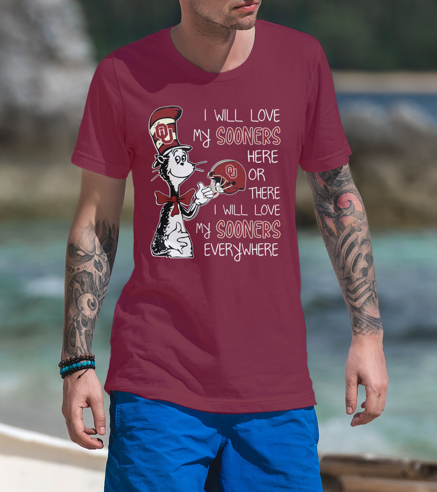 I Will Love My Sooners Here Or There I Will Love My Sooners Everywhere Dr Seuss Cat In The Hat Oklahoma Sooners T-Shirt