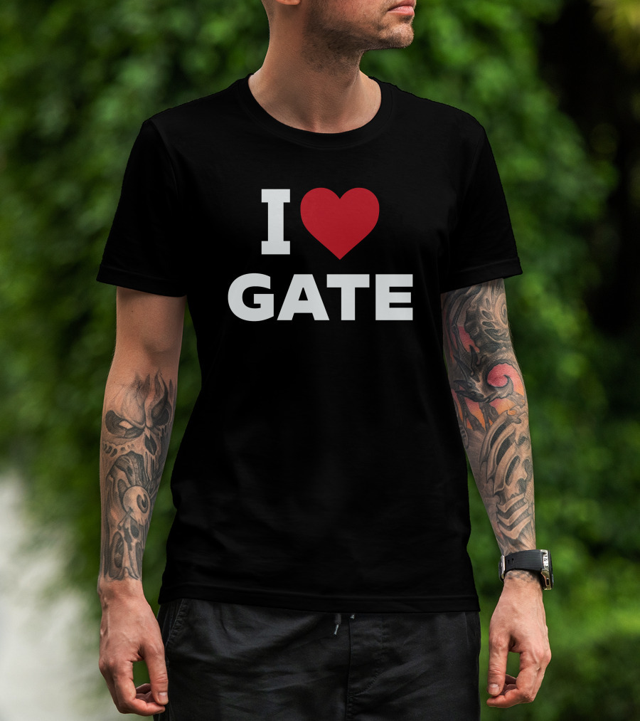 The I Love Gate Red Heart Icon Text T-shirt is designed for everyday wear and a consistent fit. Fabric is pre-shrunk ring-spun cotton with durable stitching. See the size chart below for exact measurements.