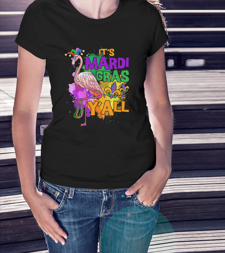 It's Mardi Gras Y'all Flamingo Carnival Beads Fleur De Lis Party Fun T-Shirt