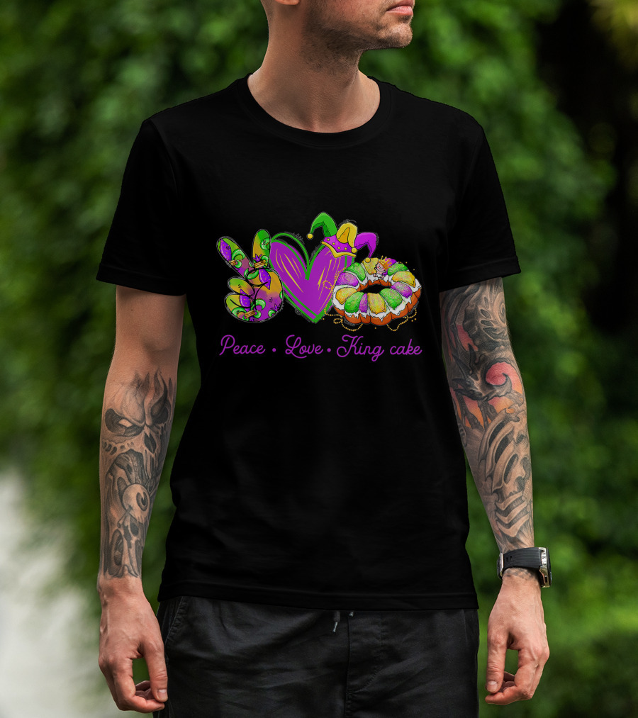 Peace Love King Cake Funny Mardi Gras Party Carnival Icons T-Shirt