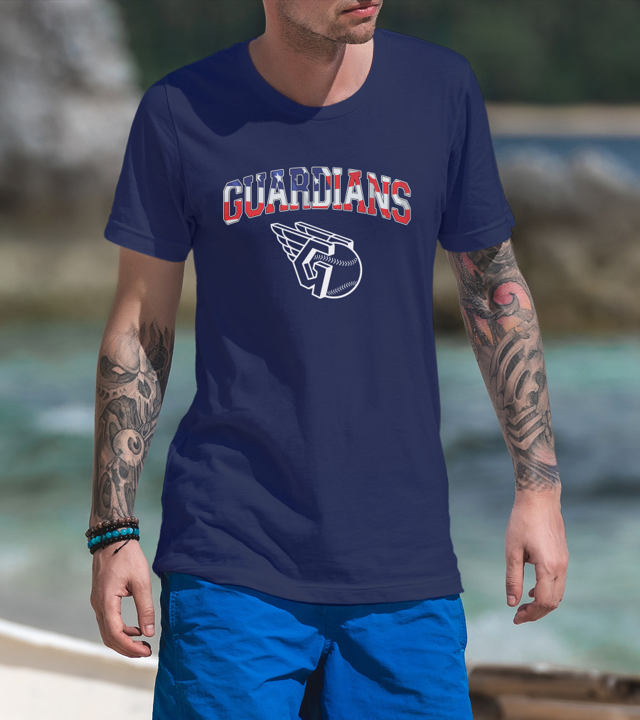 The Guardians American Flag Baseball Emblem T-shirt is designed for everyday wear and a consistent fit. Fabric is pre-shrunk ring-spun cotton with durable stitching. See the size chart below for exact measurements.