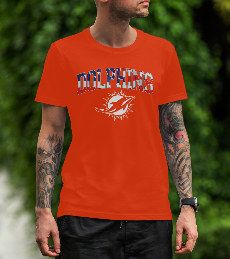 The Dolphins American Flag Miami Football T-shirt is designed for everyday wear and a consistent fit. Fabric is pre-shrunk ring-spun cotton with durable stitching. See the size chart below for exact measurements.