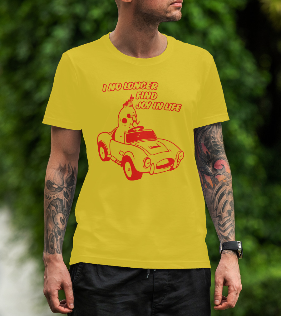 The I No Longer Find Joy In Life with Driving Bird in Car T-shirt is designed for everyday wear and a consistent fit. Fabric is pre-shrunk ring-spun cotton with durable stitching. See the size chart below for exact measurements.