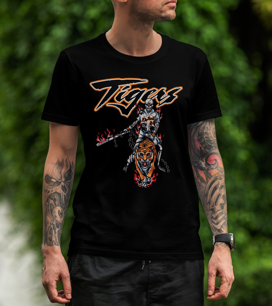The Detroit Tigers Cade Cunningham Flaming Rider and Tiger T-shirt is designed for everyday wear and a consistent fit. Fabric is pre-shrunk ring-spun cotton with durable stitching. See the size chart below for exact measurements.