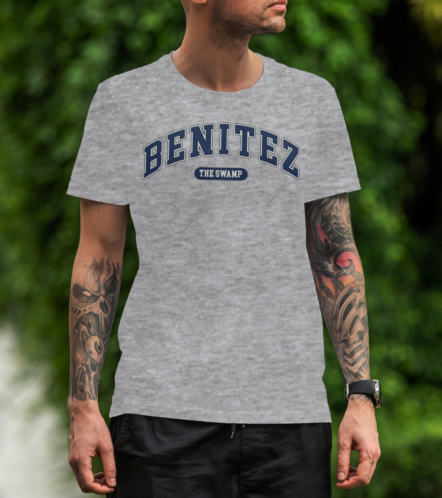 The BENITEZ THE SWAMP T-shirt is designed for everyday wear and a consistent fit. Fabric is pre-shrunk ring-spun cotton with durable stitching. See the size chart below for exact measurements.