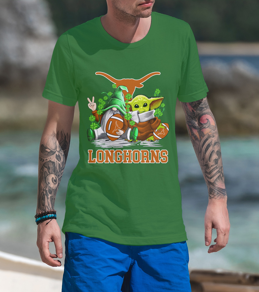 The Texas Longhorns Football Patrick’s Day Longhorns Gnome Baby Jedi T-shirt is designed for everyday wear and a consistent fit. Fabric is pre-shrunk ring-spun cotton with durable stitching. See the size chart below for exact measurements.