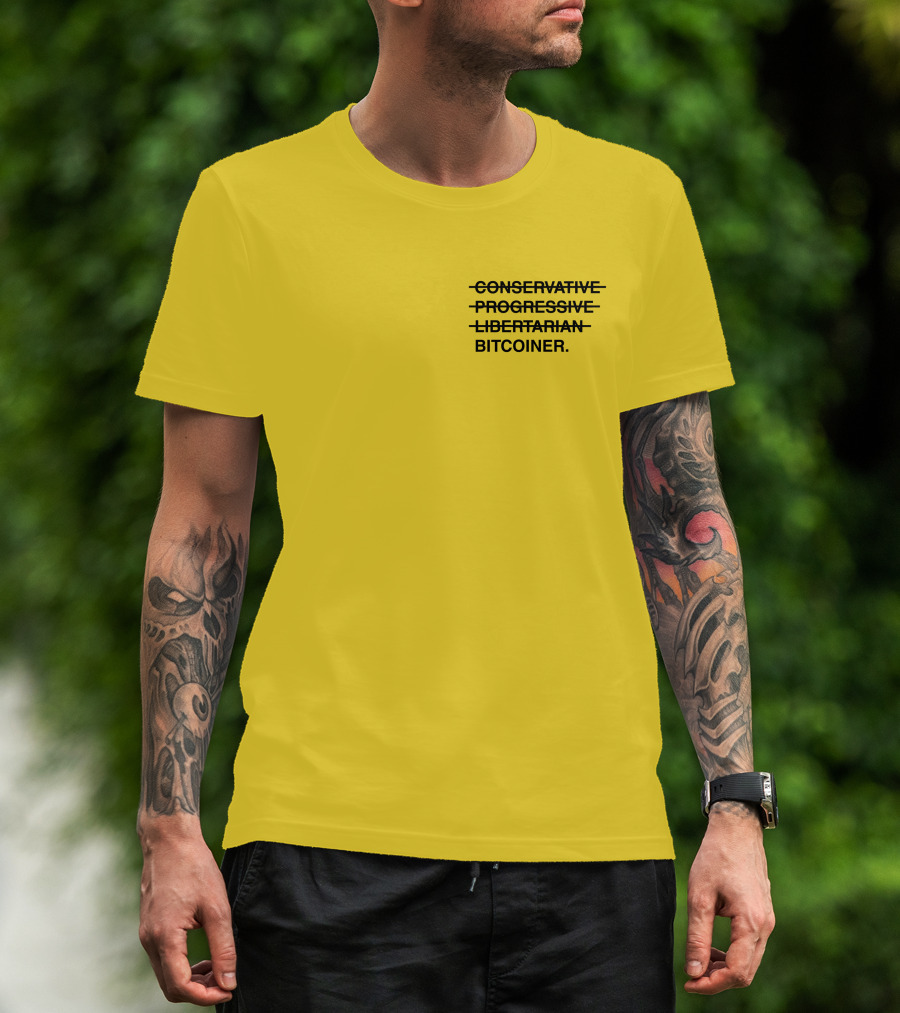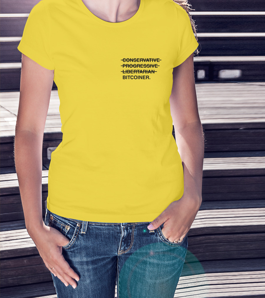 How much will this Bitcoiner with Crossed Out Conservative Progressive Libertarian shirt shrink?