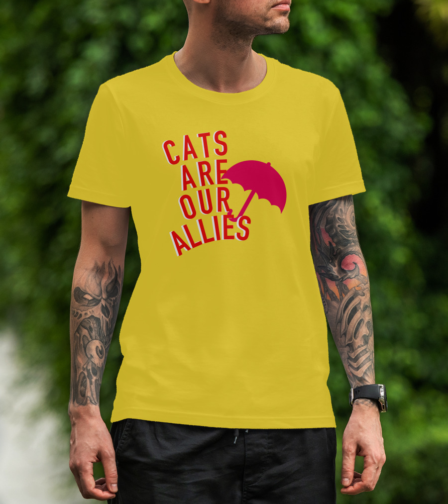 Jortsthecat Cats Are Our Allies Red Umbrella Yellow Background T-Shirt