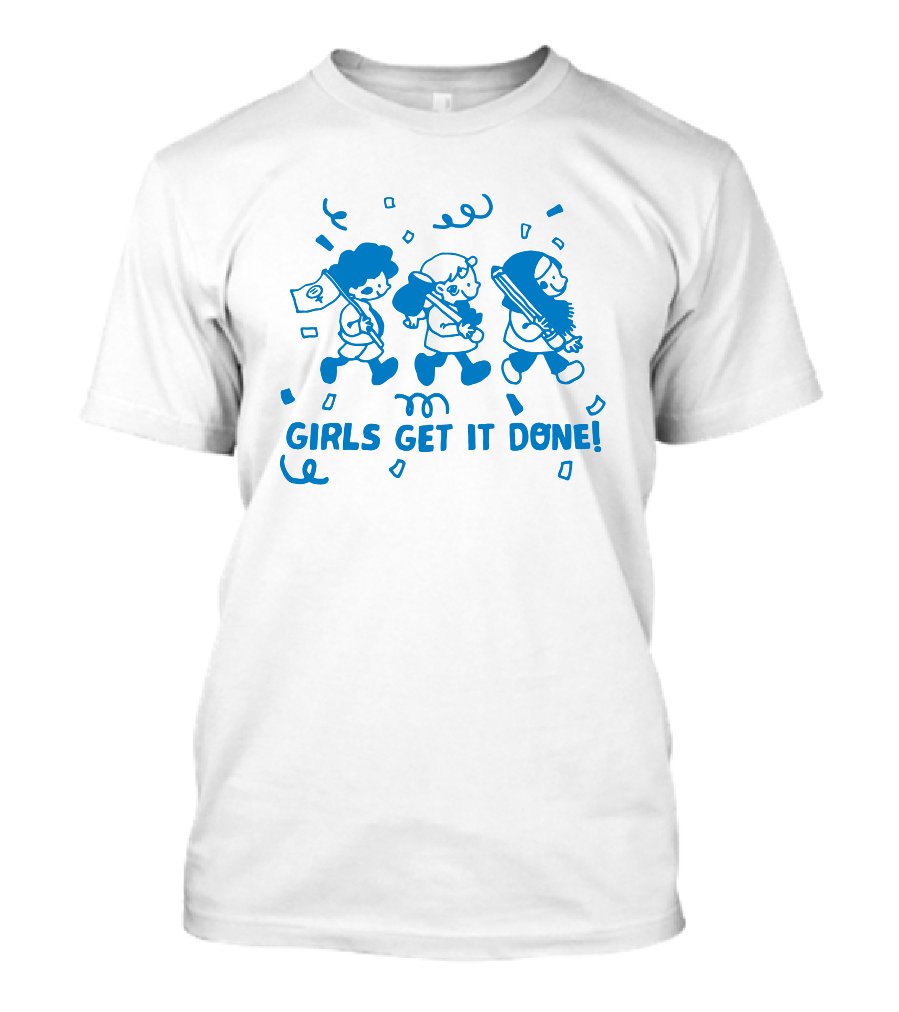 The GIRLS GET IT DONE Liliuhms Empowerment Marching Trio T-shirt is designed for everyday wear and a consistent fit. Fabric is pre-shrunk ring-spun cotton with durable stitching. See the size chart below for exact measurements.