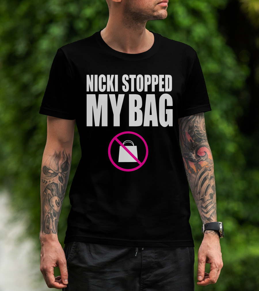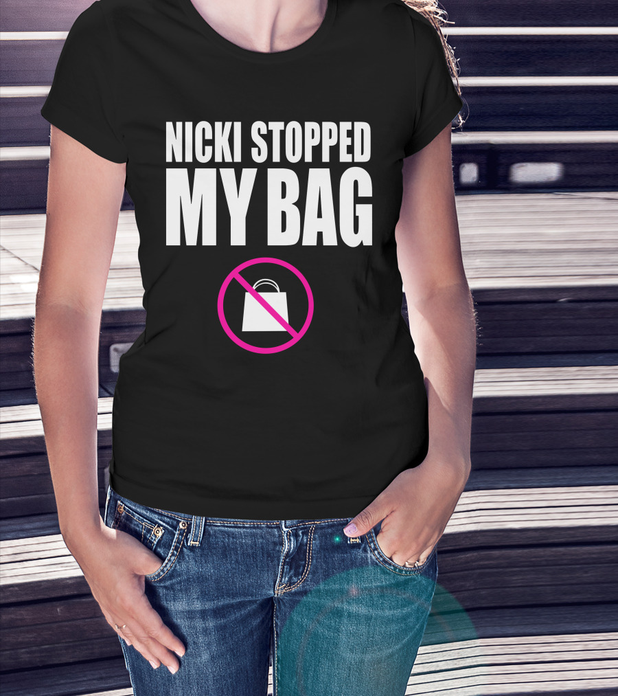 The Nicki Stopped My Bag No Shopping T-shirt is designed for everyday wear and a consistent fit. Fabric is pre-shrunk ring-spun cotton with durable stitching. See the size chart below for exact measurements.