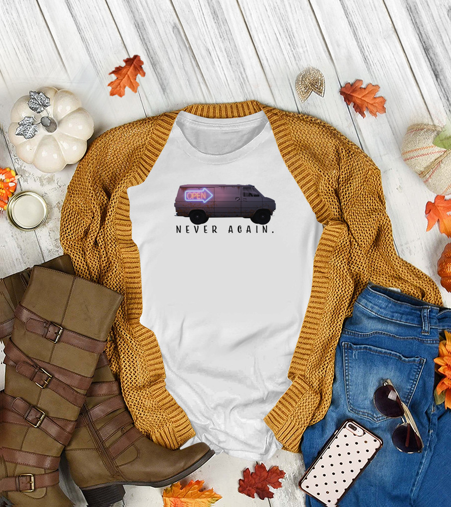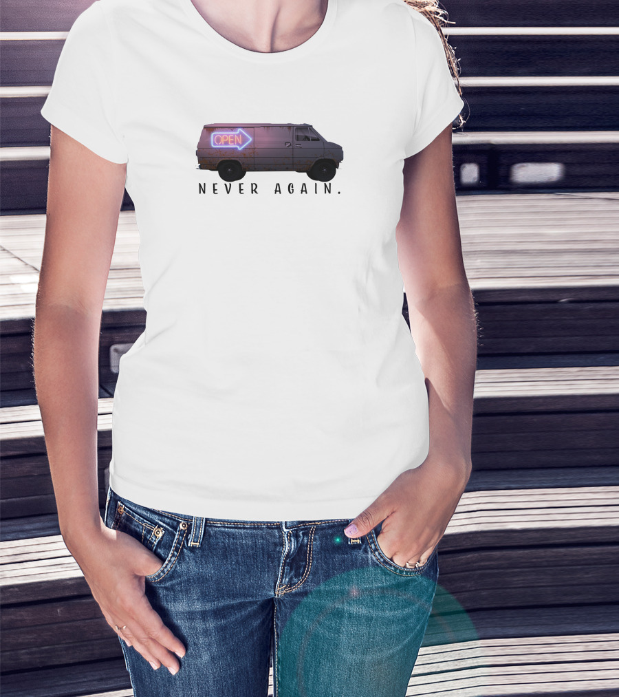 The Open Van Never Again Neon Sign T-shirt is designed for everyday wear and a consistent fit. Fabric is pre-shrunk ring-spun cotton with durable stitching. See the size chart below for exact measurements.