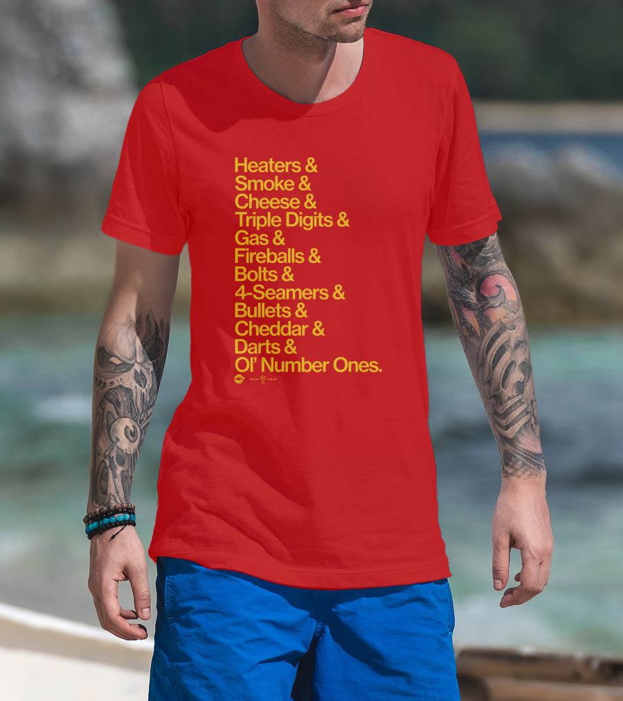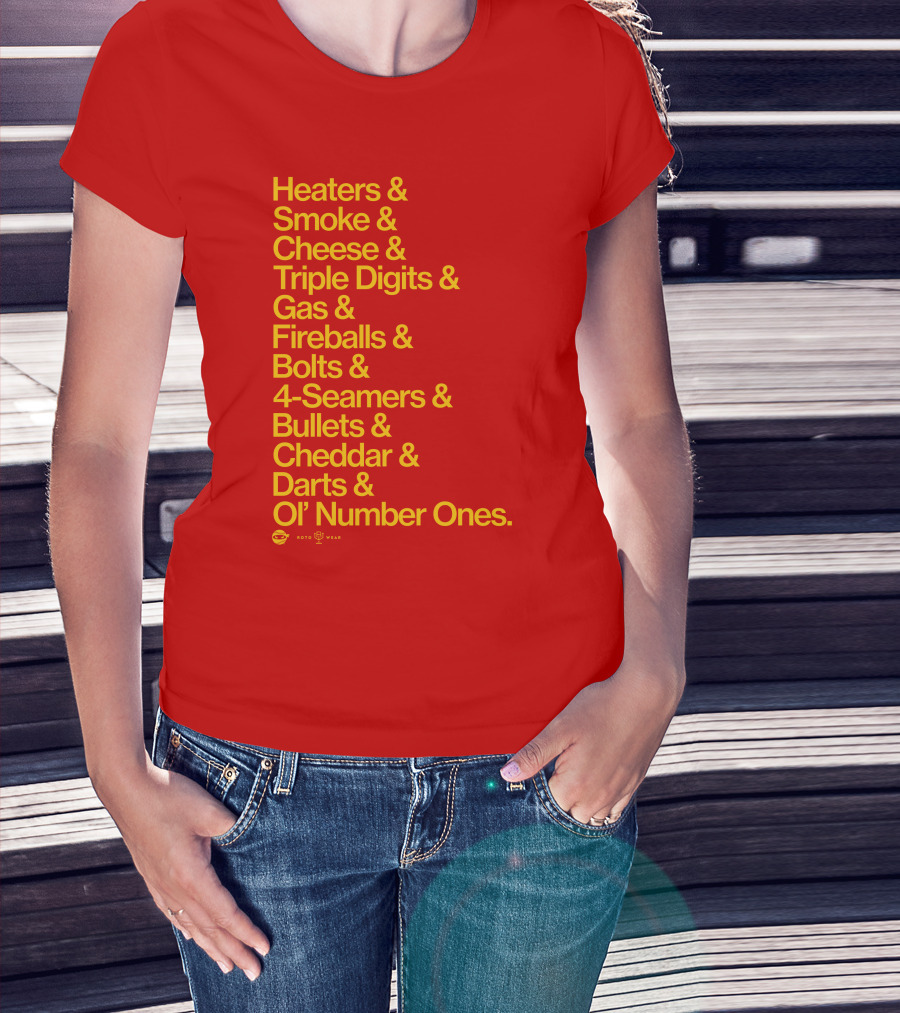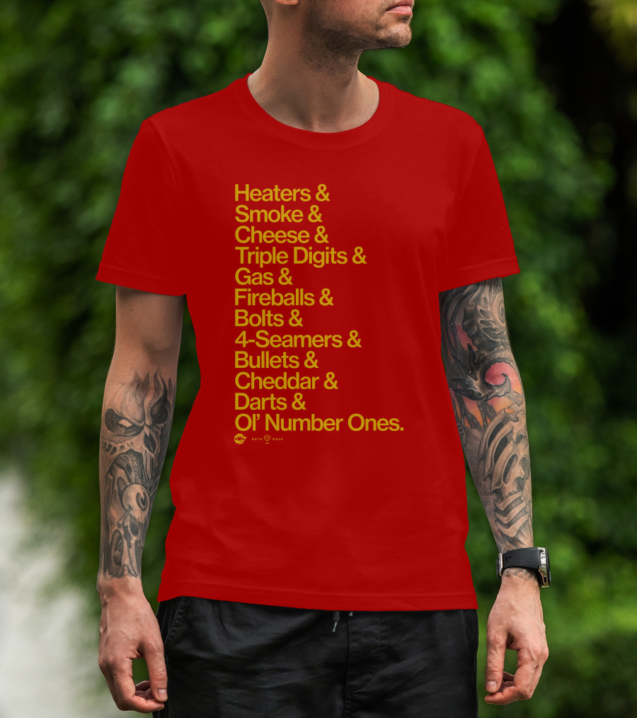 Heaters Smoke Cheese Triple Digits Gas Fireballs Bolts 4-Seamers Bullets Cheddar Darts Ol’ Number Ones Rotowear Fastball Nicknames T-Shirt