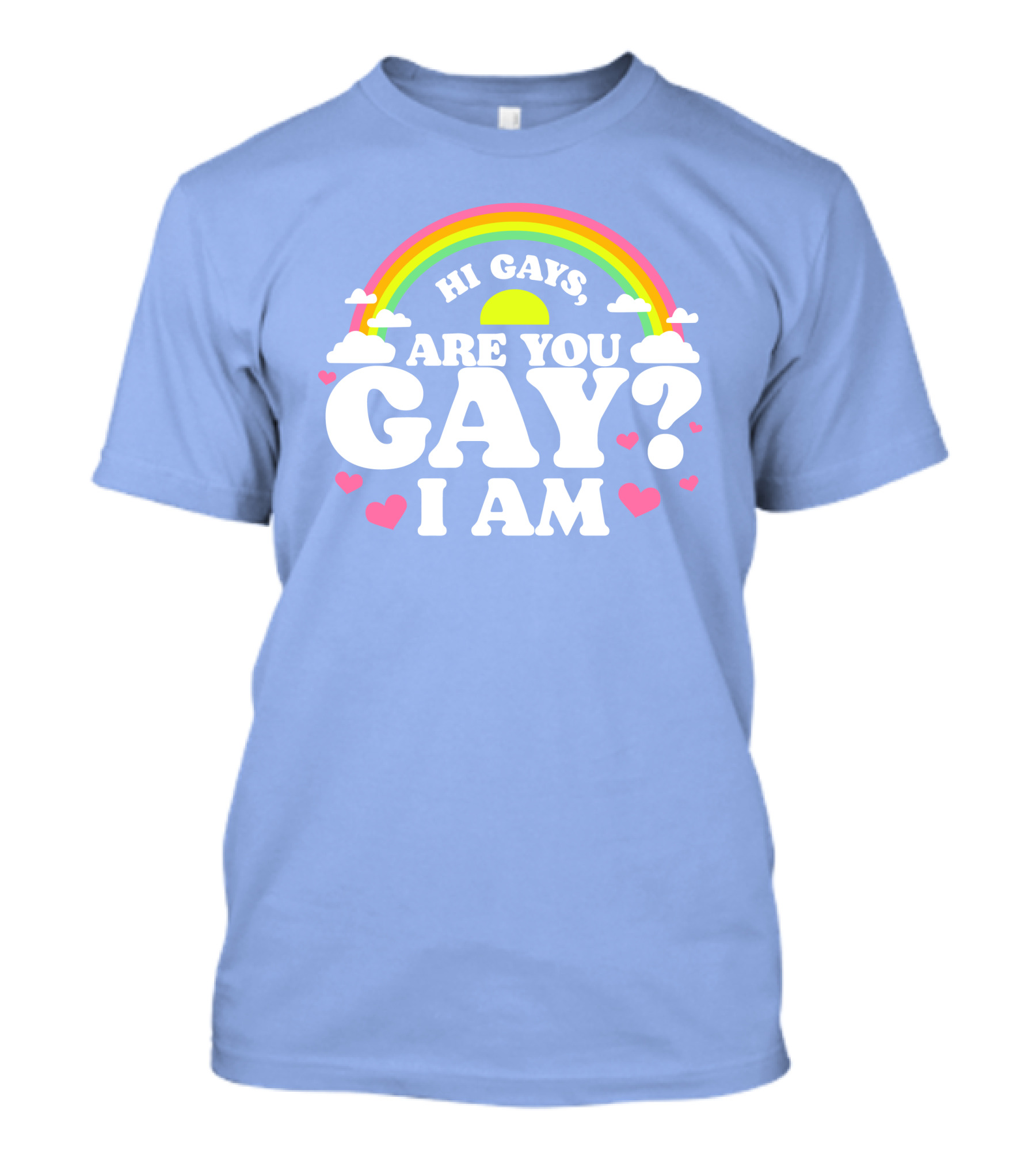 The Hi Gays Are You Gay I Am Rainbow Hearts T-shirt is designed for everyday wear and a consistent fit. Fabric is pre-shrunk ring-spun cotton with durable stitching. See the size chart below for exact measurements.