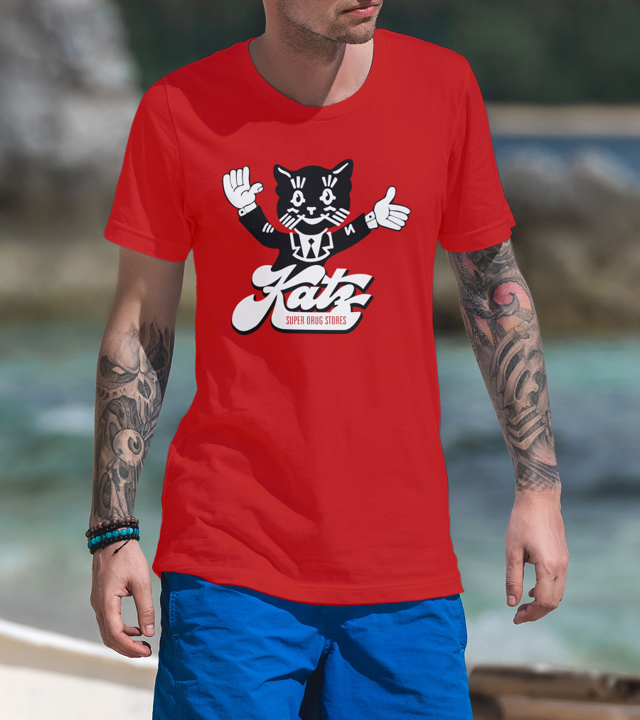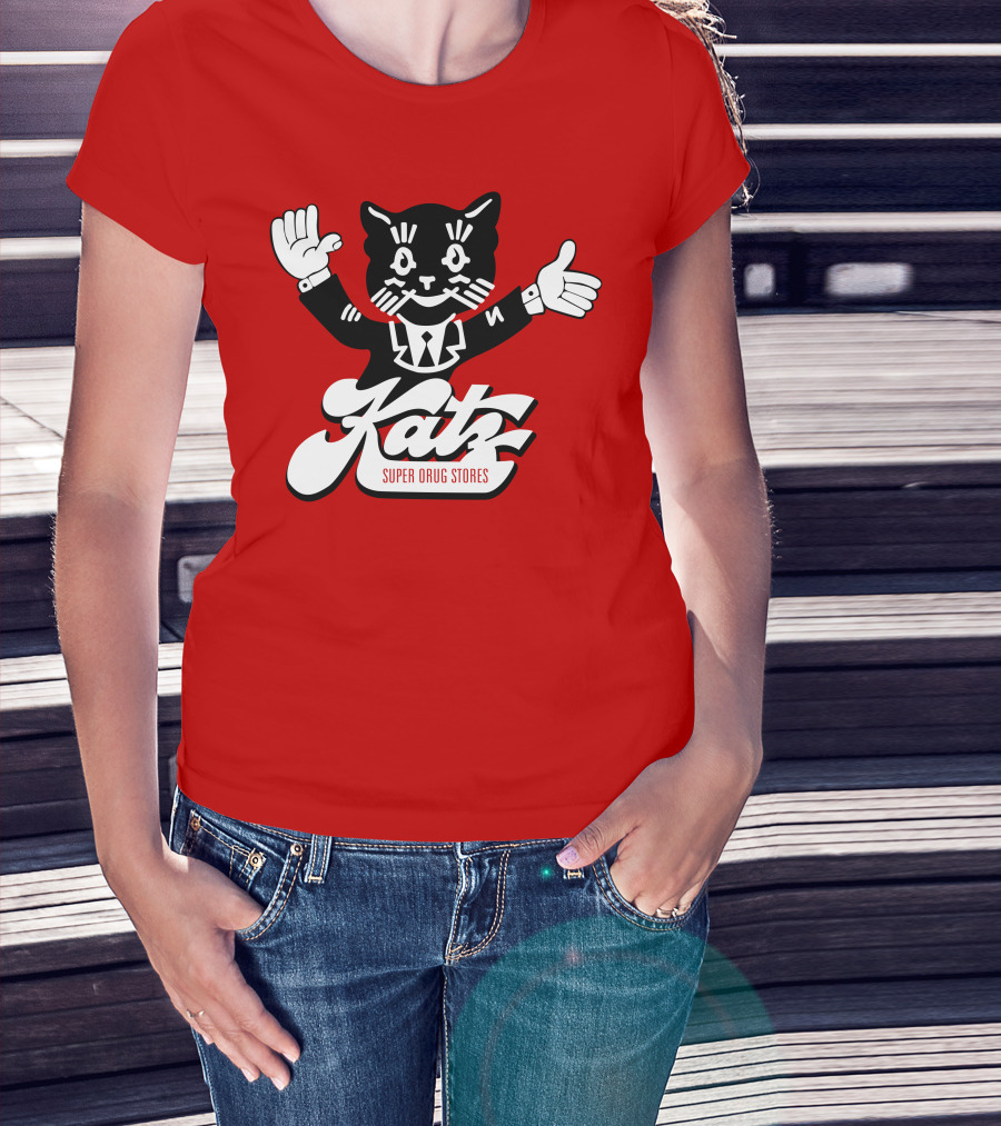 Katz Super Drug Stores Cat Mascot Smiling And Waving In Suit And Tie T-Shirt