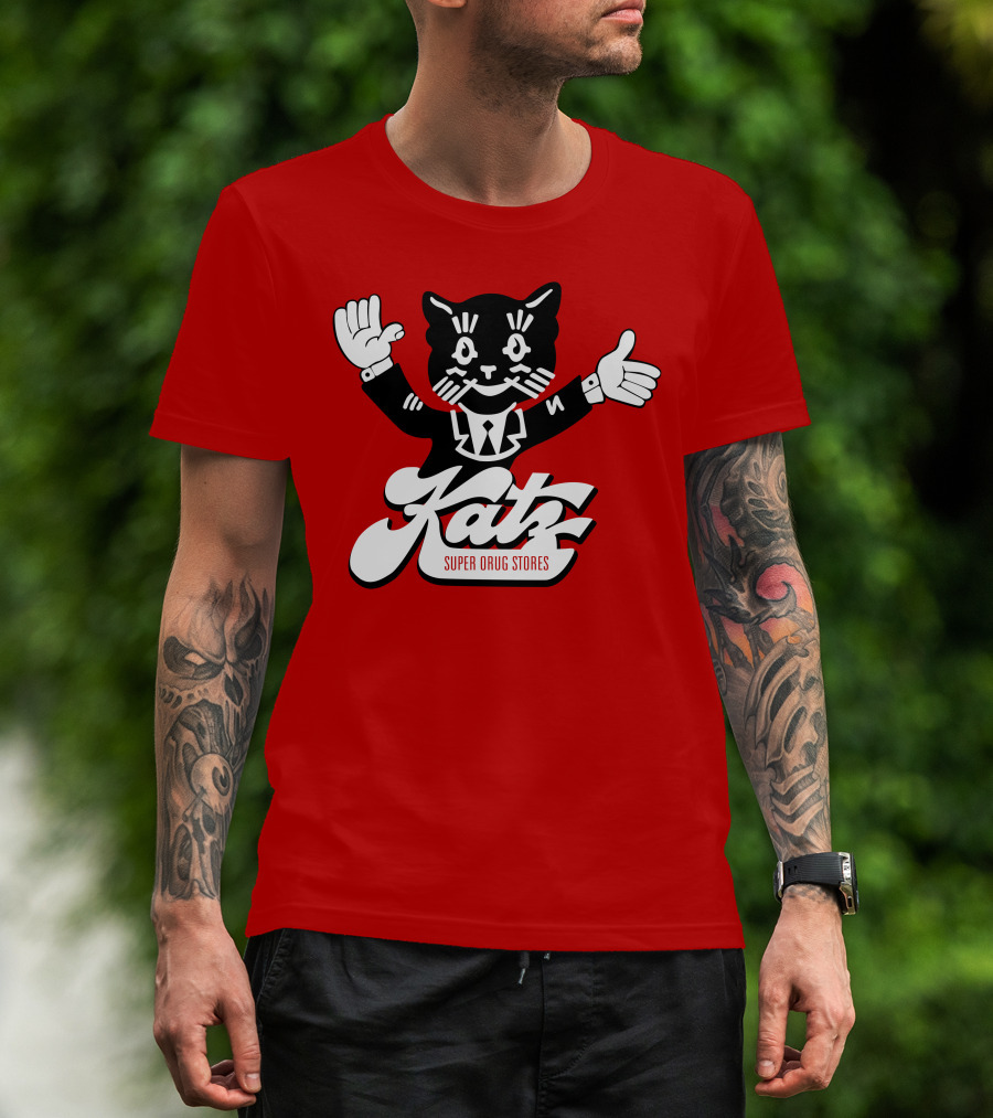The Katz Super Drug Stores Cat Mascot Smiling and Waving in Suit and Tie T-shirt is designed for everyday wear and a consistent fit. Fabric is pre-shrunk ring-spun cotton with durable stitching. See the size chart below for exact measurements.
