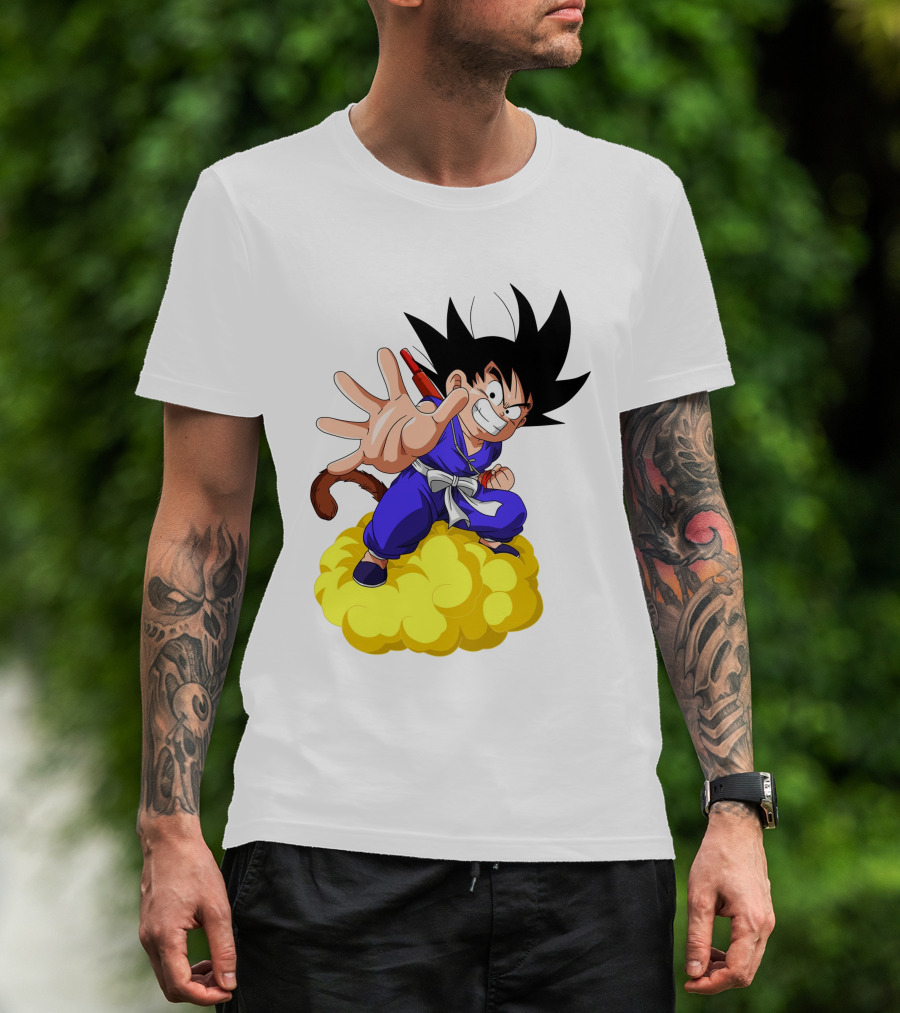 The Goku Kid Riding Flying Nimbus Dragon Ball Classic Image T-shirt is designed for everyday wear and a consistent fit. Fabric is pre-shrunk ring-spun cotton with durable stitching. See the size chart below for exact measurements.