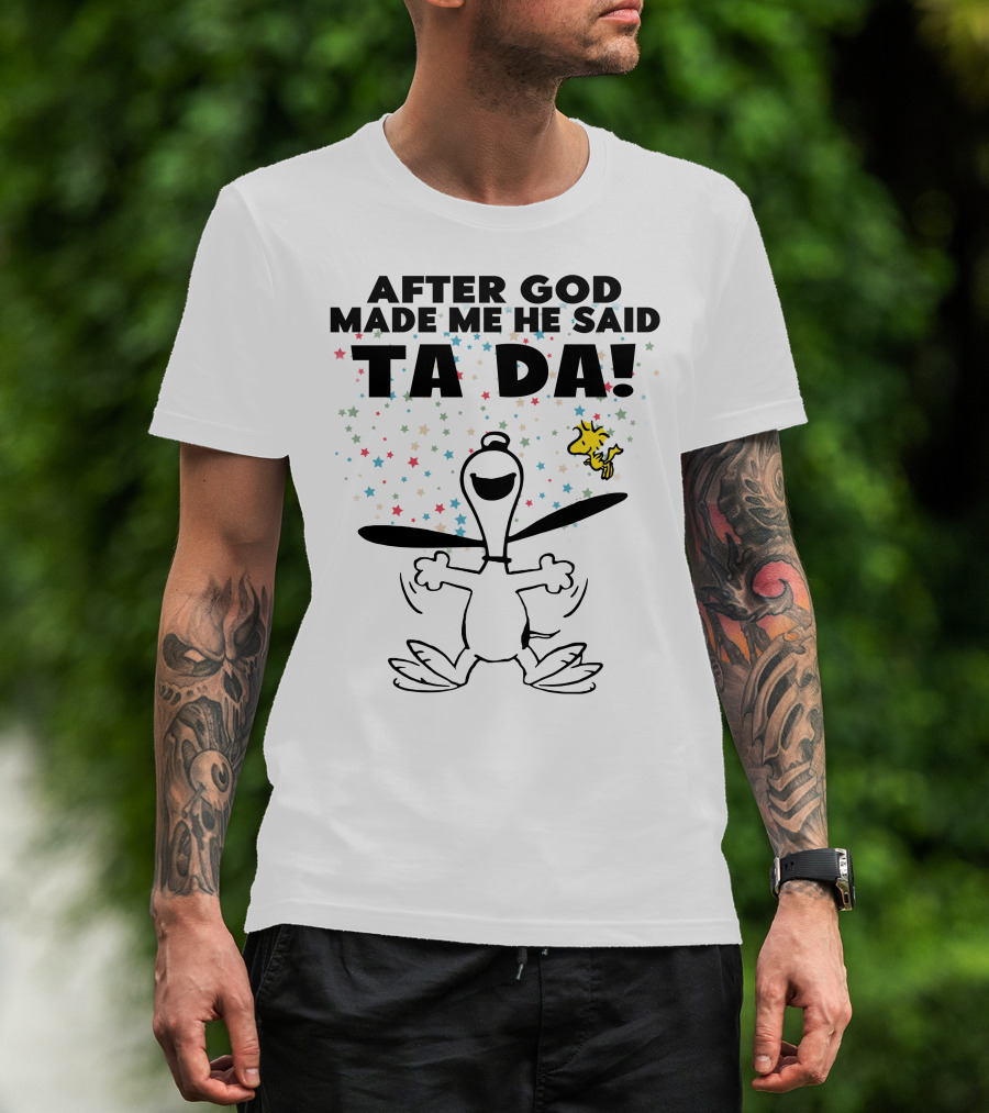 The After God Made Me He Said Ta Da Snoopy and Woodstock Celebration Stars T-shirt is designed for everyday wear and a consistent fit. Fabric is pre-shrunk ring-spun cotton with durable stitching. See the size chart below for exact measurements.