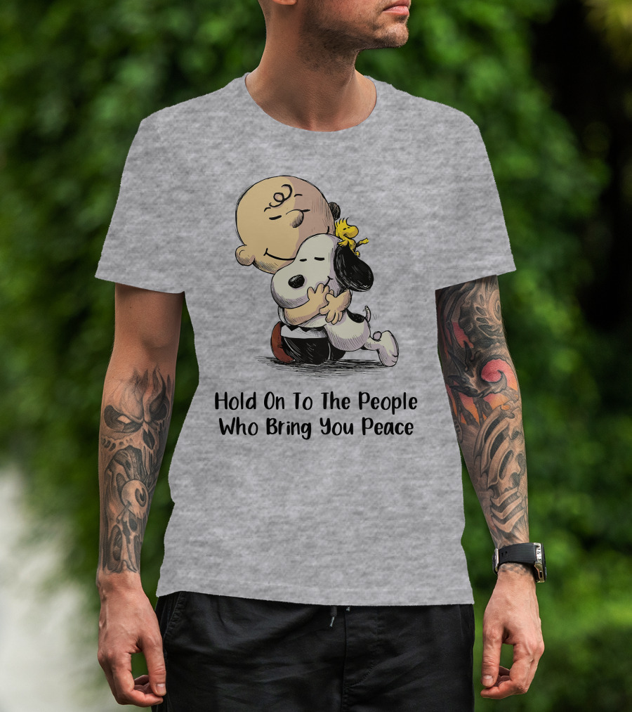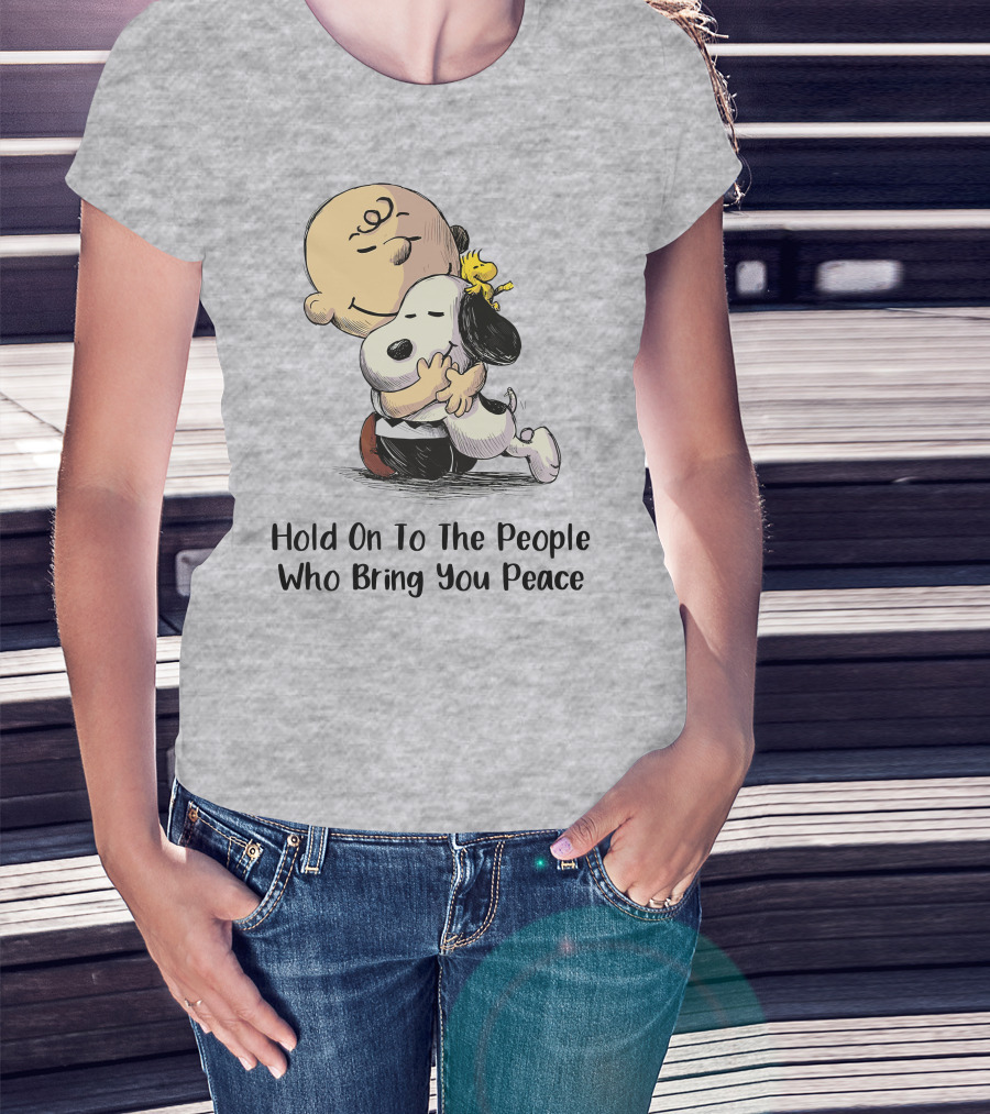 Hold On To The People Who Bring You Peace Charlie Brown Snoopy Woodstock Hug T-Shirt