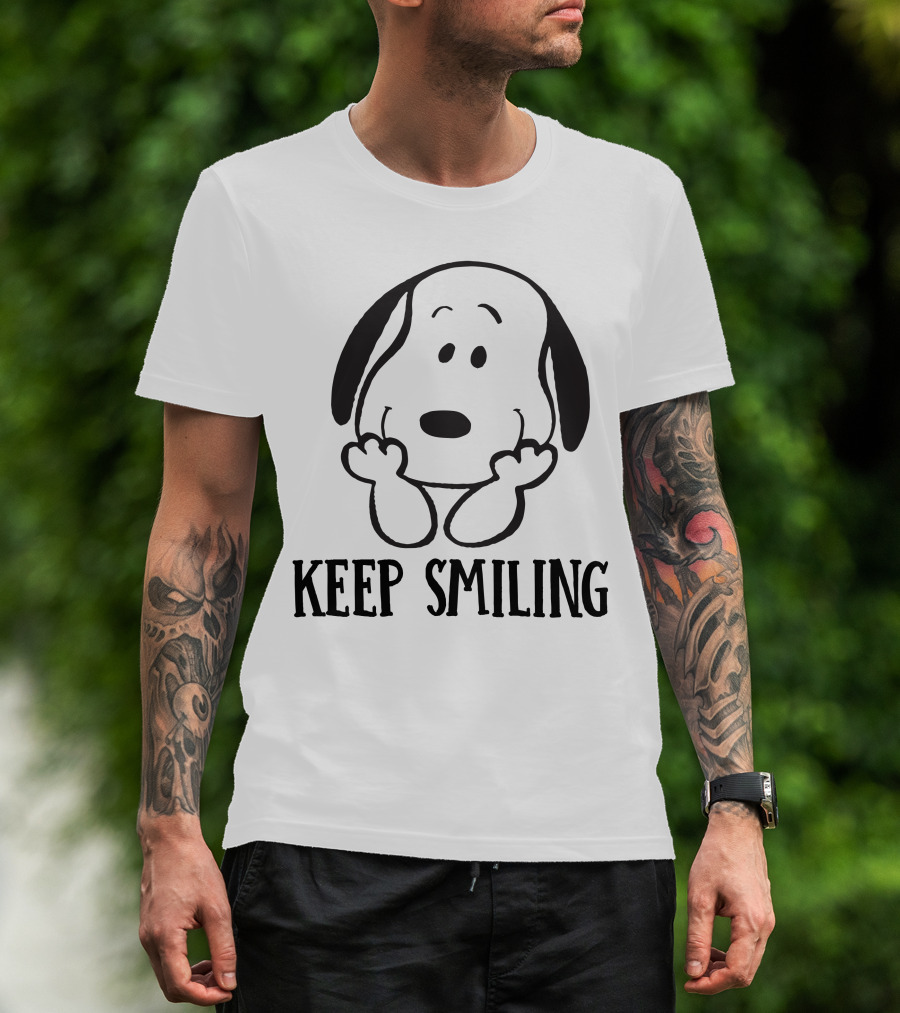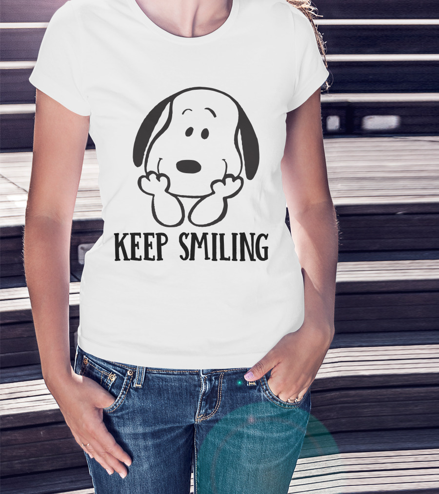 The Keep Smiling Snoopy Peanuts T-shirt is designed for everyday wear and a consistent fit. Fabric is pre-shrunk ring-spun cotton with durable stitching. See the size chart below for exact measurements.