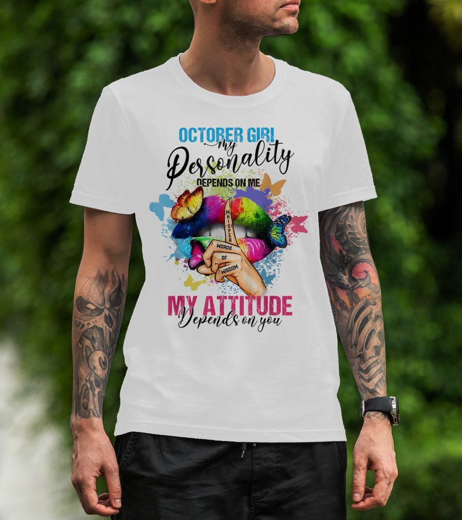 OCTOBER GIRL MY PERSONALITY DEPENDS ON ME MY ATTITUDE DEPENDS ON YOU WHISPER WORDS OF WISDOM T-Shirt