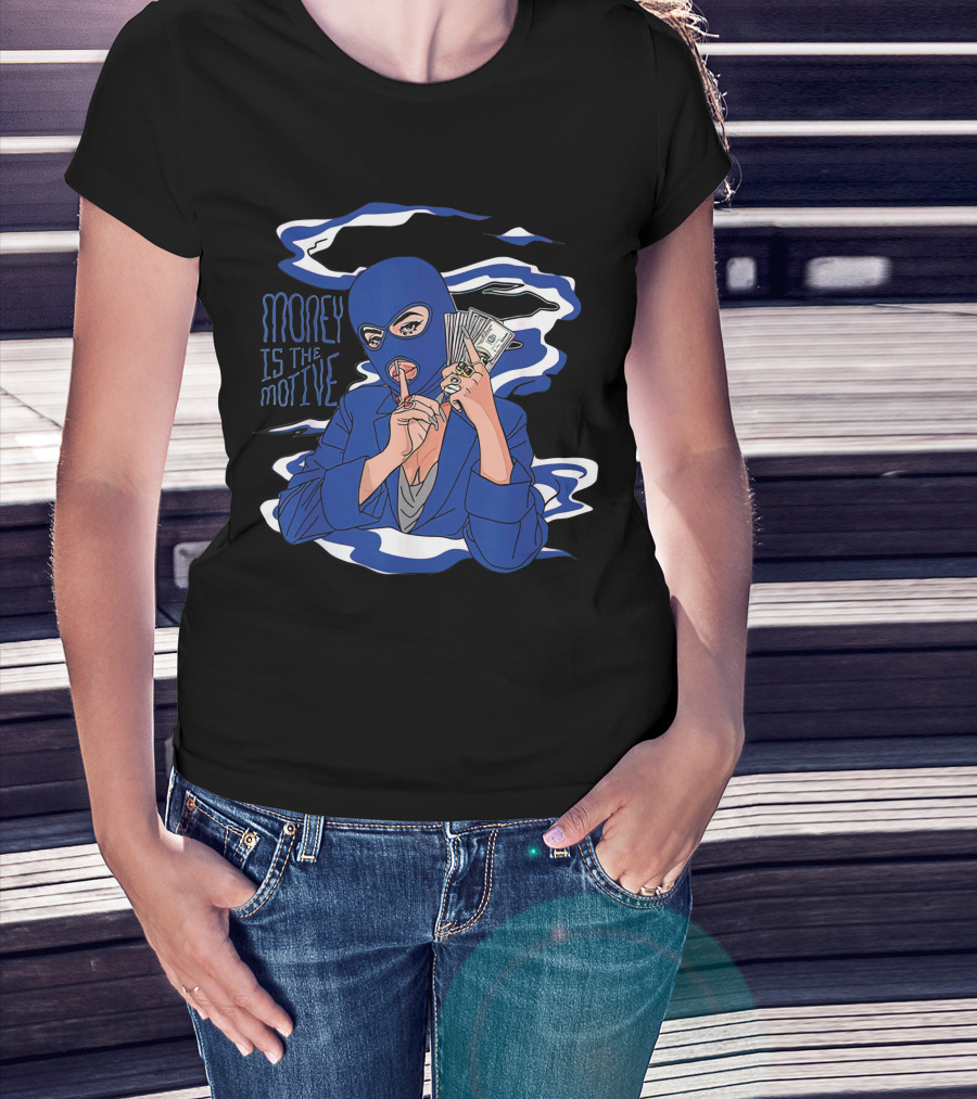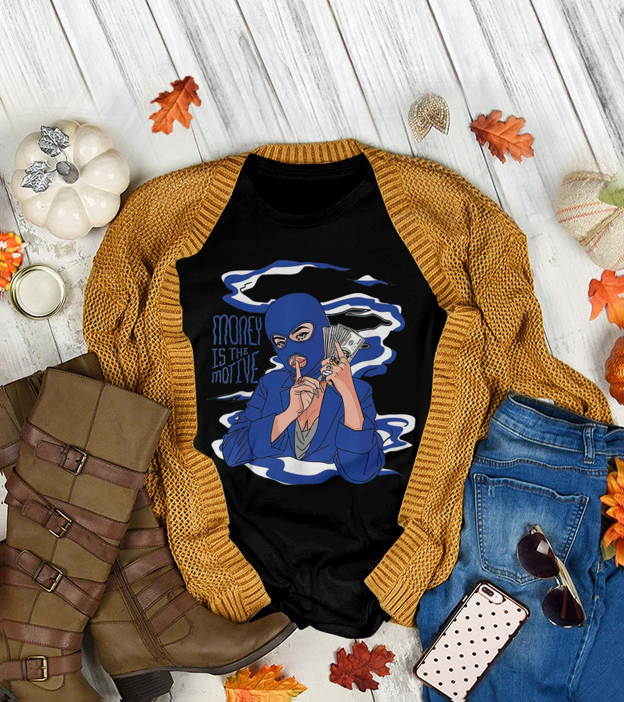 The Money Is The Motive Racer Blue 5s T-shirt is designed for everyday wear and a consistent fit. Fabric is pre-shrunk ring-spun cotton with durable stitching. See the size chart below for exact measurements.