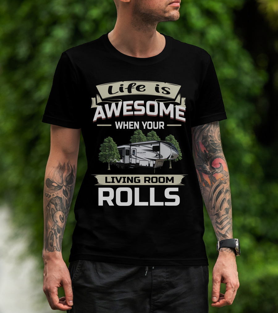 The Life Is Awesome When Your Living Room Rolls Grand Design Reflection 311 BHS Owners T-shirt is designed for everyday wear and a consistent fit. Fabric is pre-shrunk ring-spun cotton with durable stitching. See the size chart below for exact measurements.