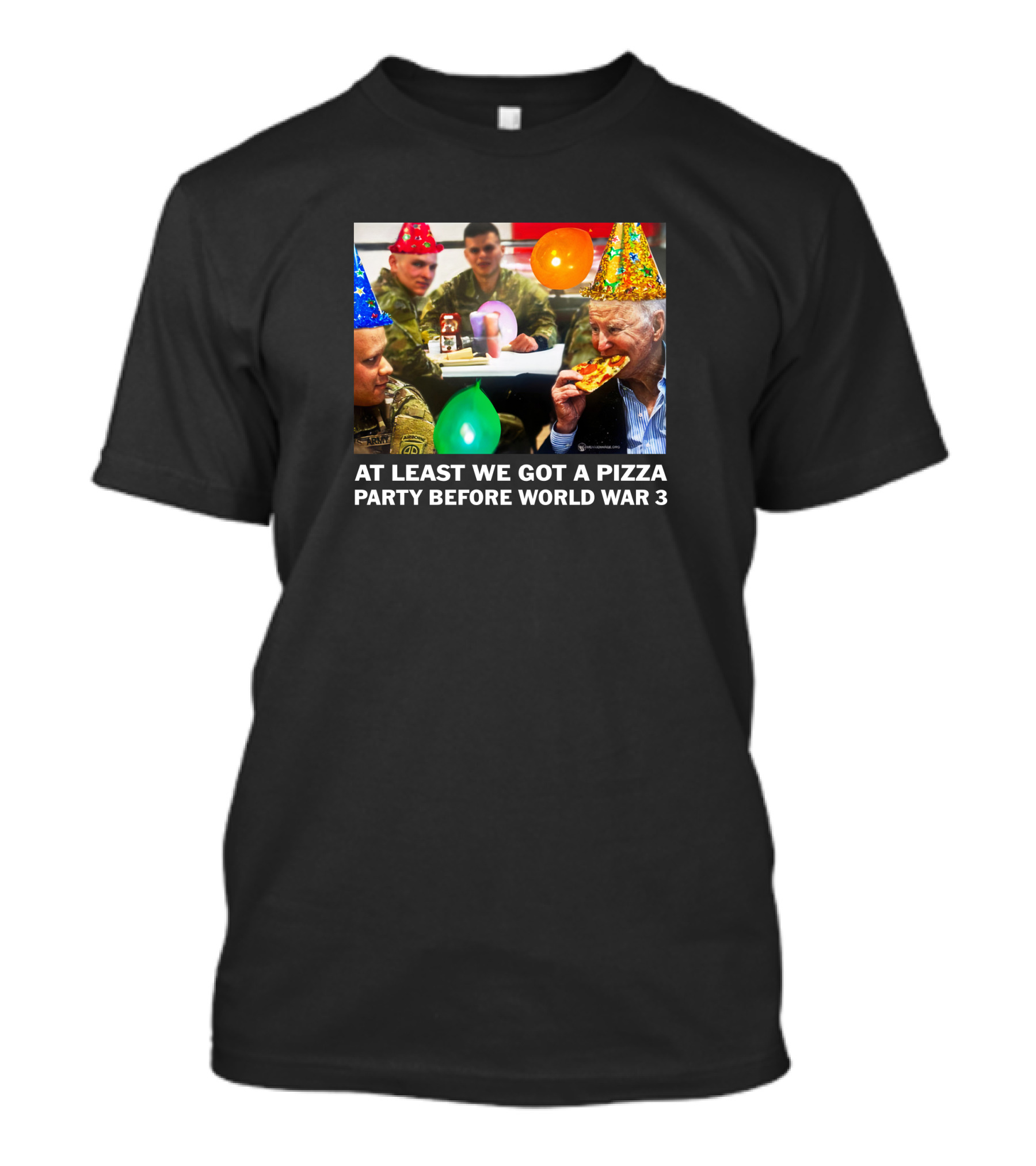 The We Are Change Store At Least We Got A Pizza Party Before World War 3 Luke Rudkowski Party Hats and Balloons T-shirt is designed for everyday wear and a consistent fit. Fabric is pre-shrunk ring-spun cotton with durable stitching. See the size chart below for exact measurements.