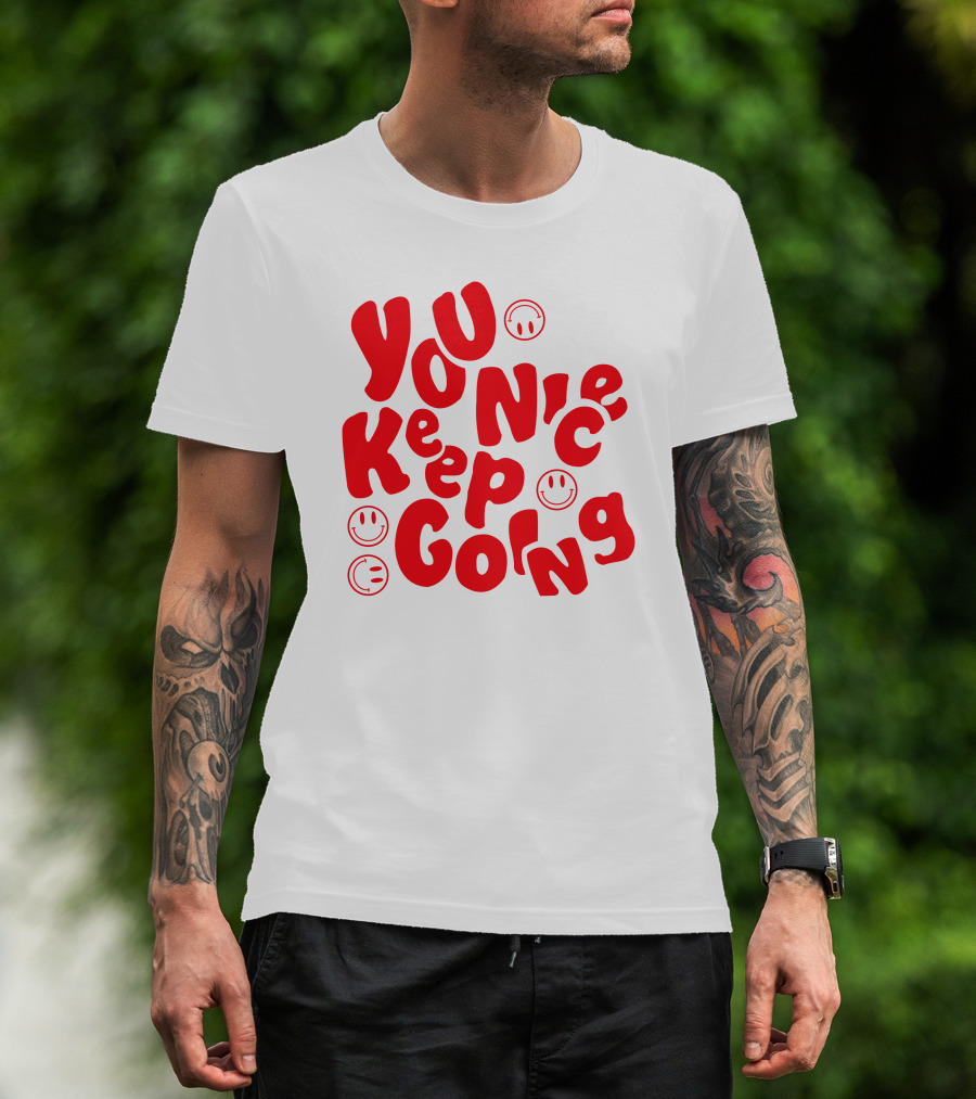 The You Nice Keep Going Smiley Faces T-shirt is designed for everyday wear and a consistent fit. Fabric is pre-shrunk ring-spun cotton with durable stitching. See the size chart below for exact measurements.