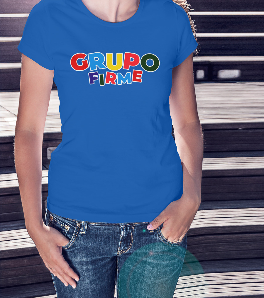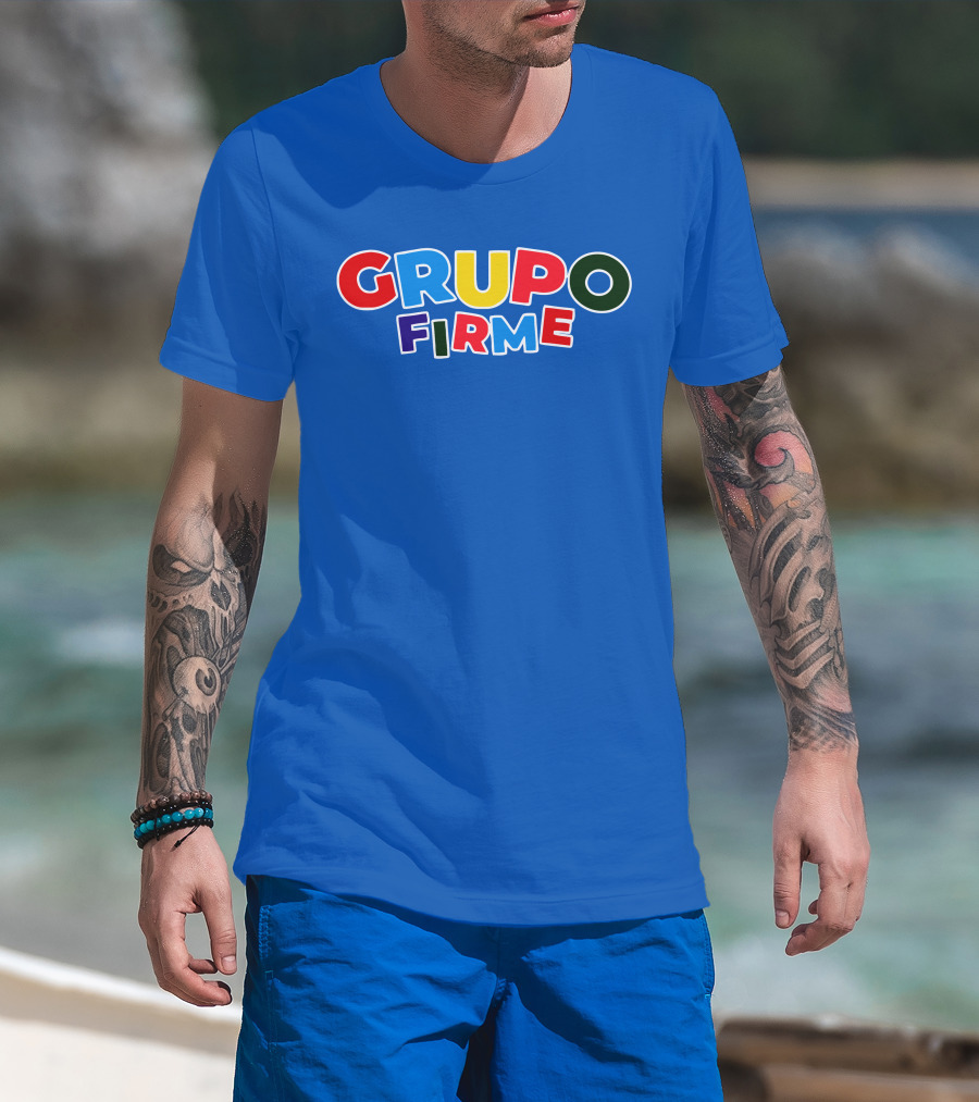 GRUPO FIRME Merch Bold Colorful Text On Blue T-Shirt