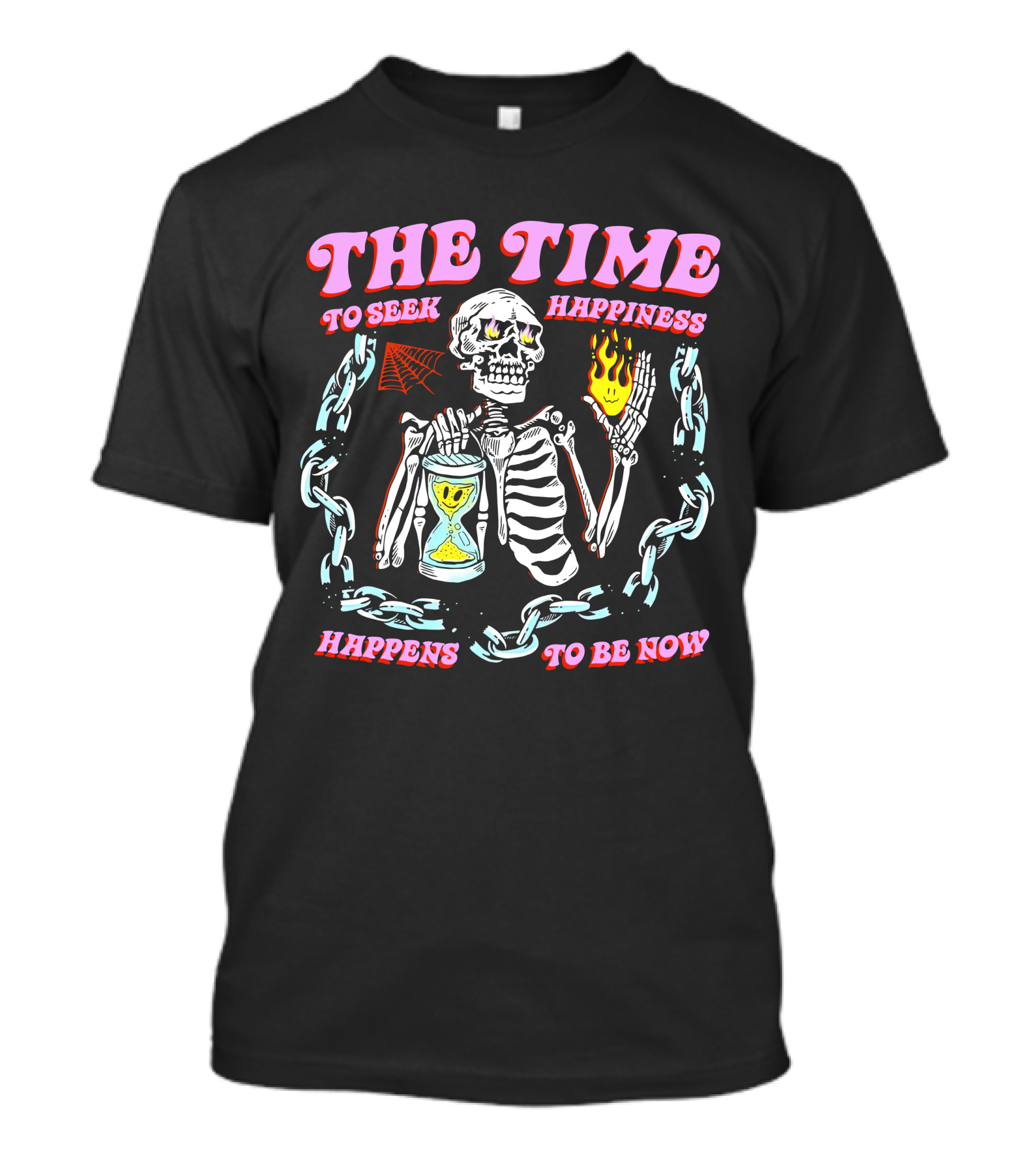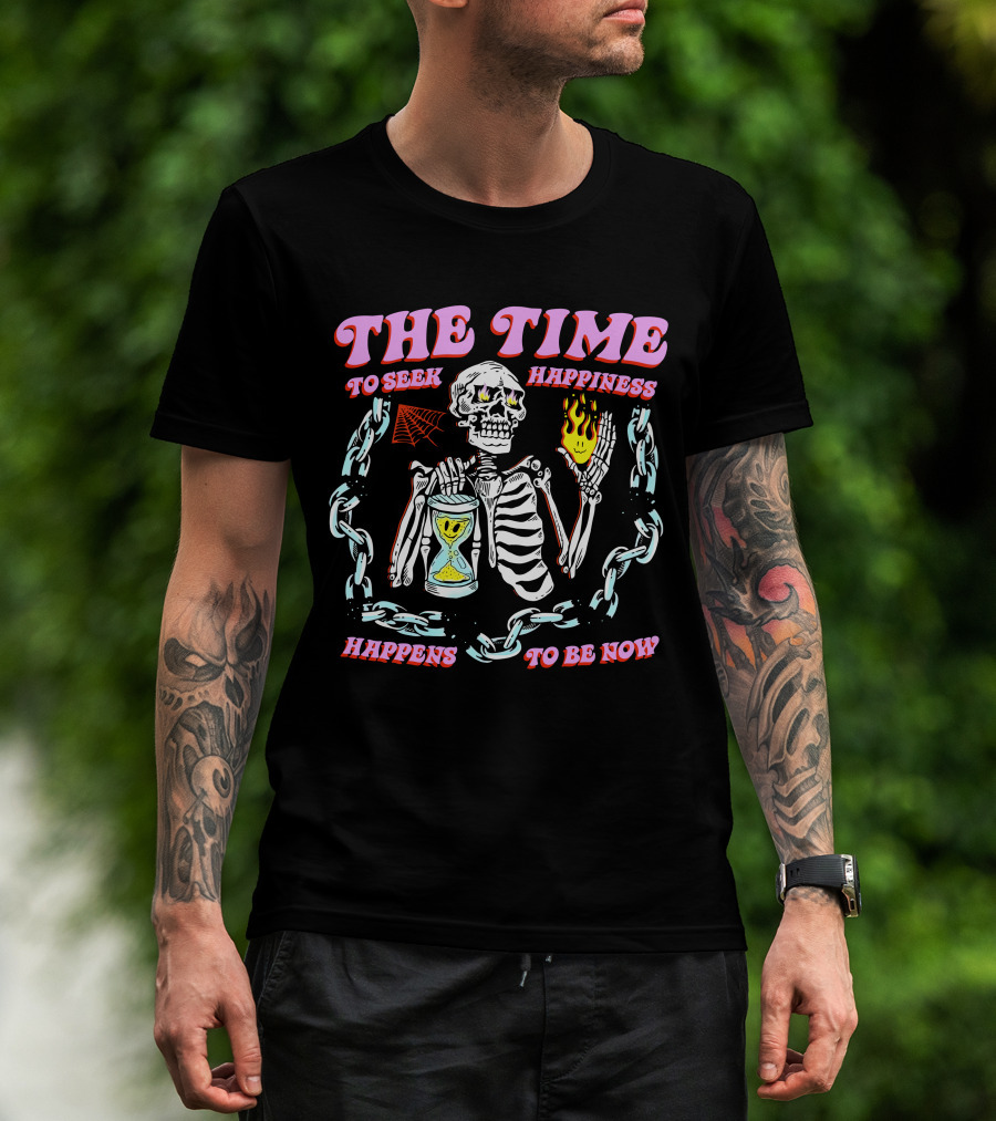 THE TIME TO SEEK HAPPINESS HAPPENS TO BE NOW SKELETON WITH HOURGLASS AND FLAME T-Shirt