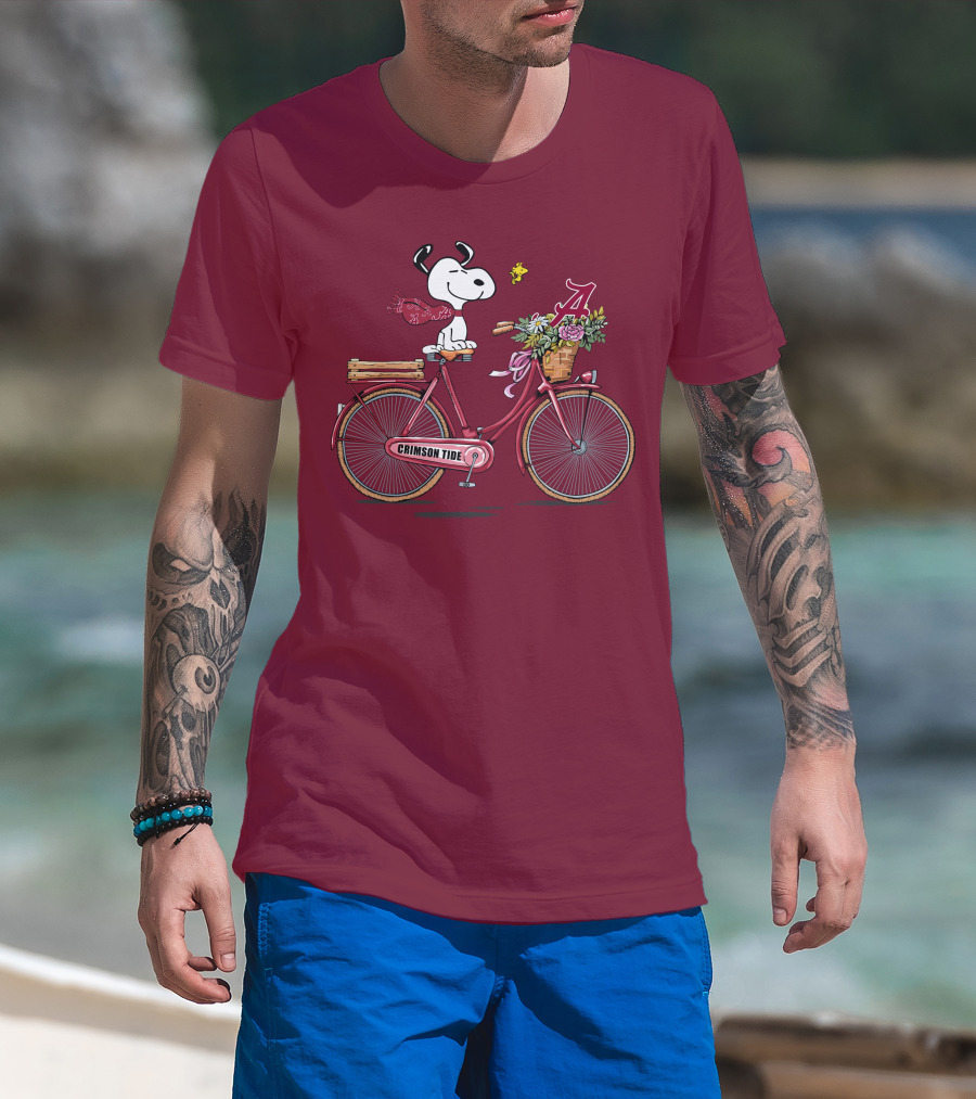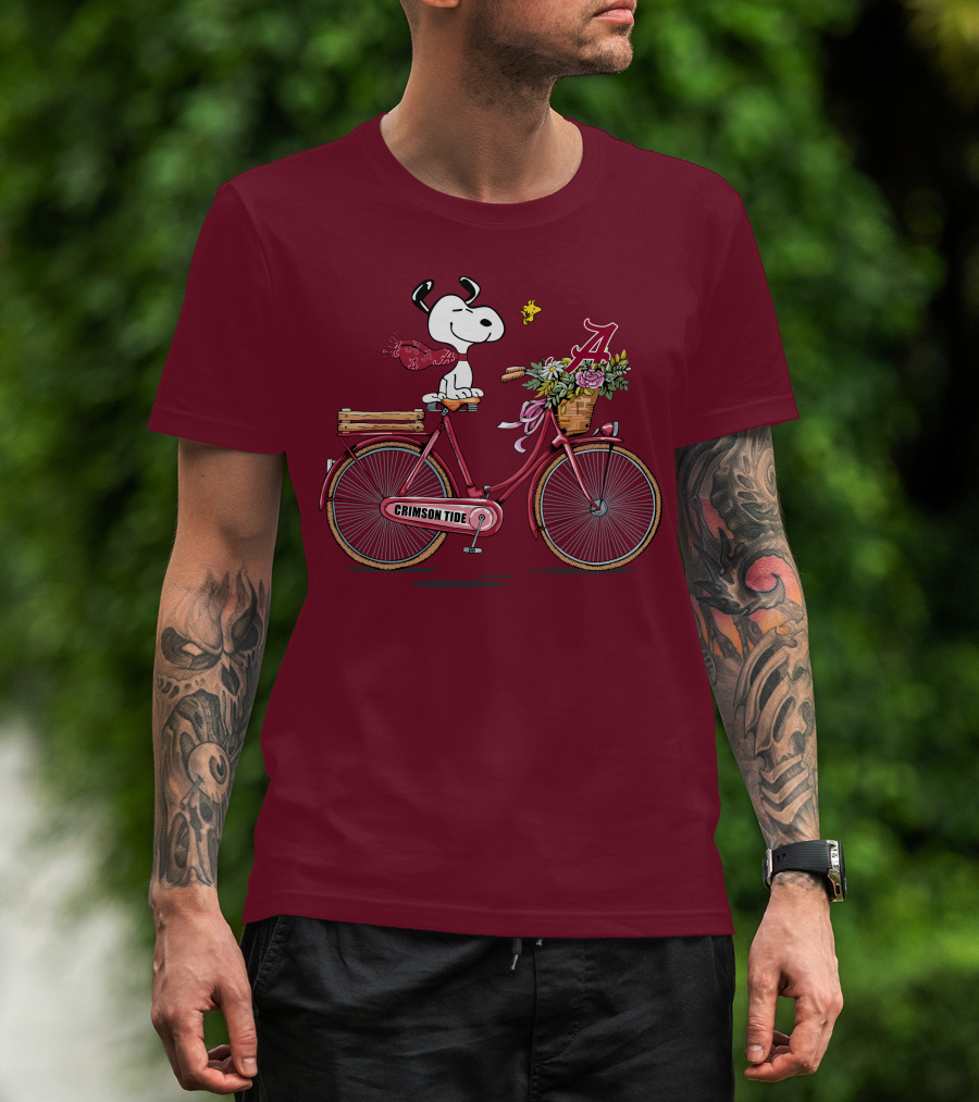 Alabama Crimson Tide Snoopy On Bicycle With Flowers And Woodstock T-Shirt