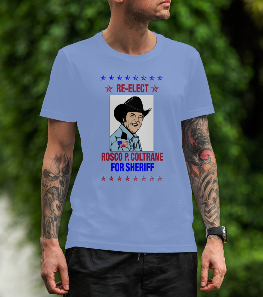 The Re-Elect Rosco P. Coltrane For Sheriff Star-Spangled Campaign T-shirt is designed for everyday wear and a consistent fit. Fabric is pre-shrunk ring-spun cotton with durable stitching. See the size chart below for exact measurements.