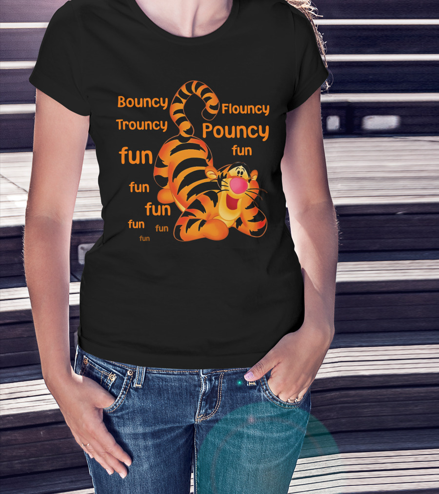 The Bouncy Trouncy Flouncy Pouncy Fun Fun Fun Tigger T-shirt is designed for everyday wear and a consistent fit. Fabric is pre-shrunk ring-spun cotton with durable stitching. See the size chart below for exact measurements.