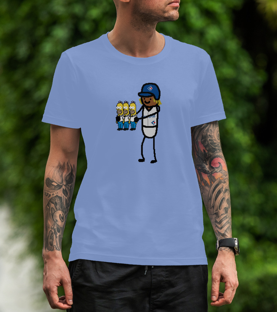 The Toronto Blue Jays Vladimir Guerrero Jr. Holding Cartoon Characters and Three Homers T-shirt is designed for everyday wear and a consistent fit. Fabric is pre-shrunk ring-spun cotton with durable stitching. See the size chart below for exact measurements.