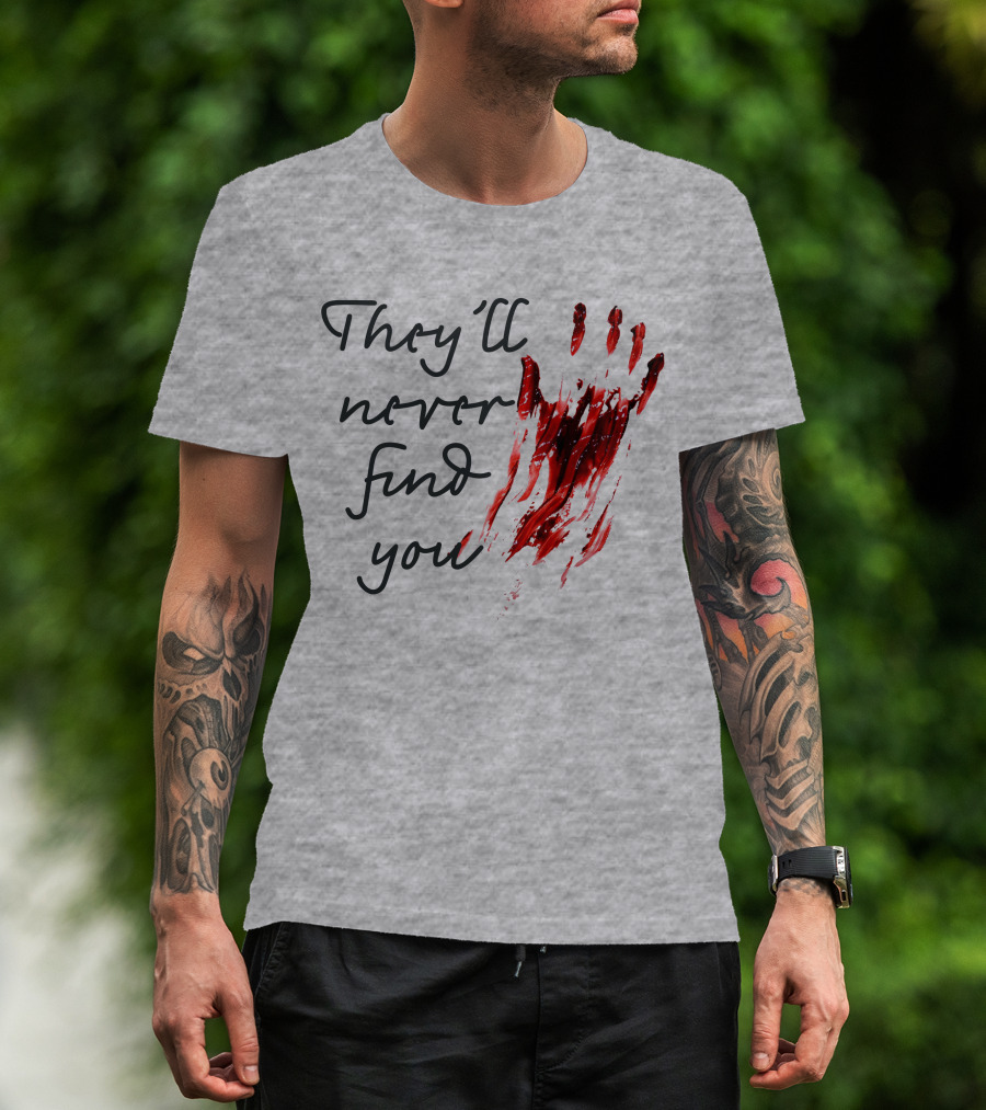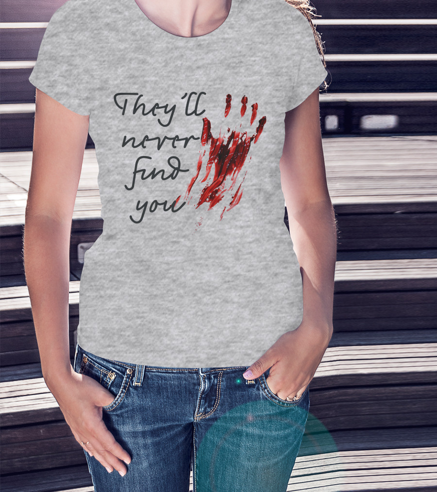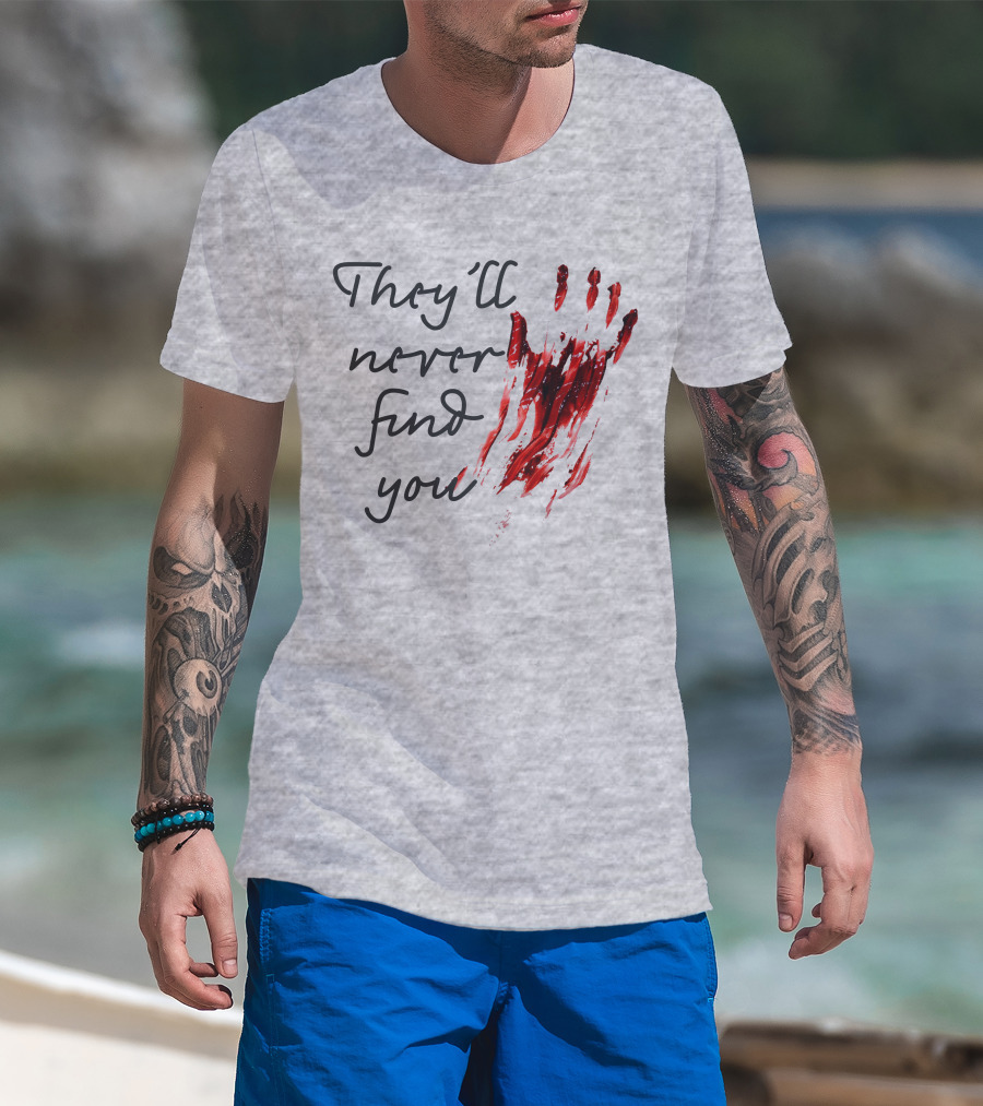 They'll Never Find You Bloody Handprint Horror Movie Scary T-Shirt