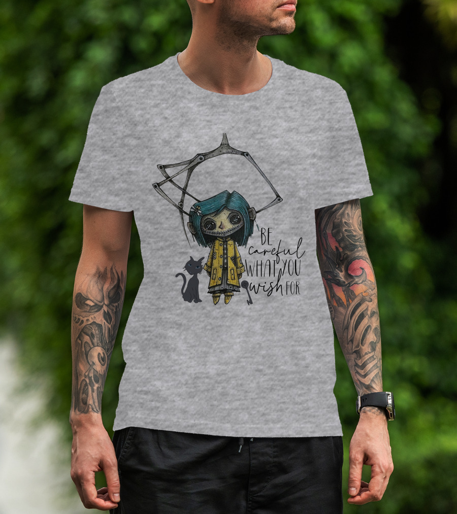 The Be Careful What You Wish For Doll with Cat T-shirt is designed for everyday wear and a consistent fit. Fabric is pre-shrunk ring-spun cotton with durable stitching. See the size chart below for exact measurements.