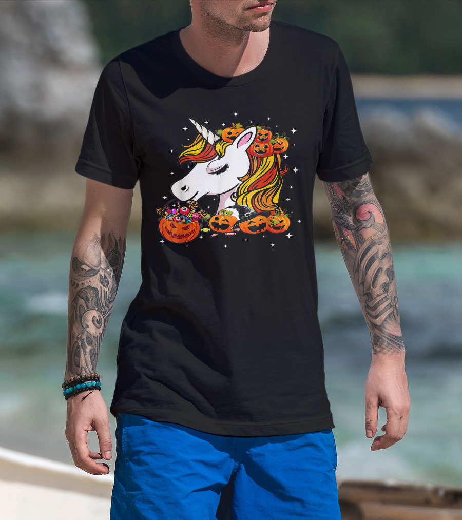 Candy Corn Unicorn Surrounded By Jack-O-Lanterns And Candy-Eyed Treats Halloween T-Shirt