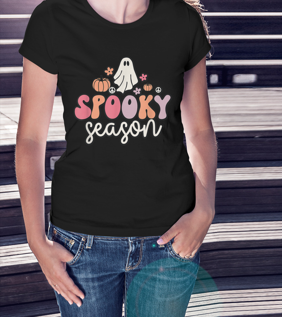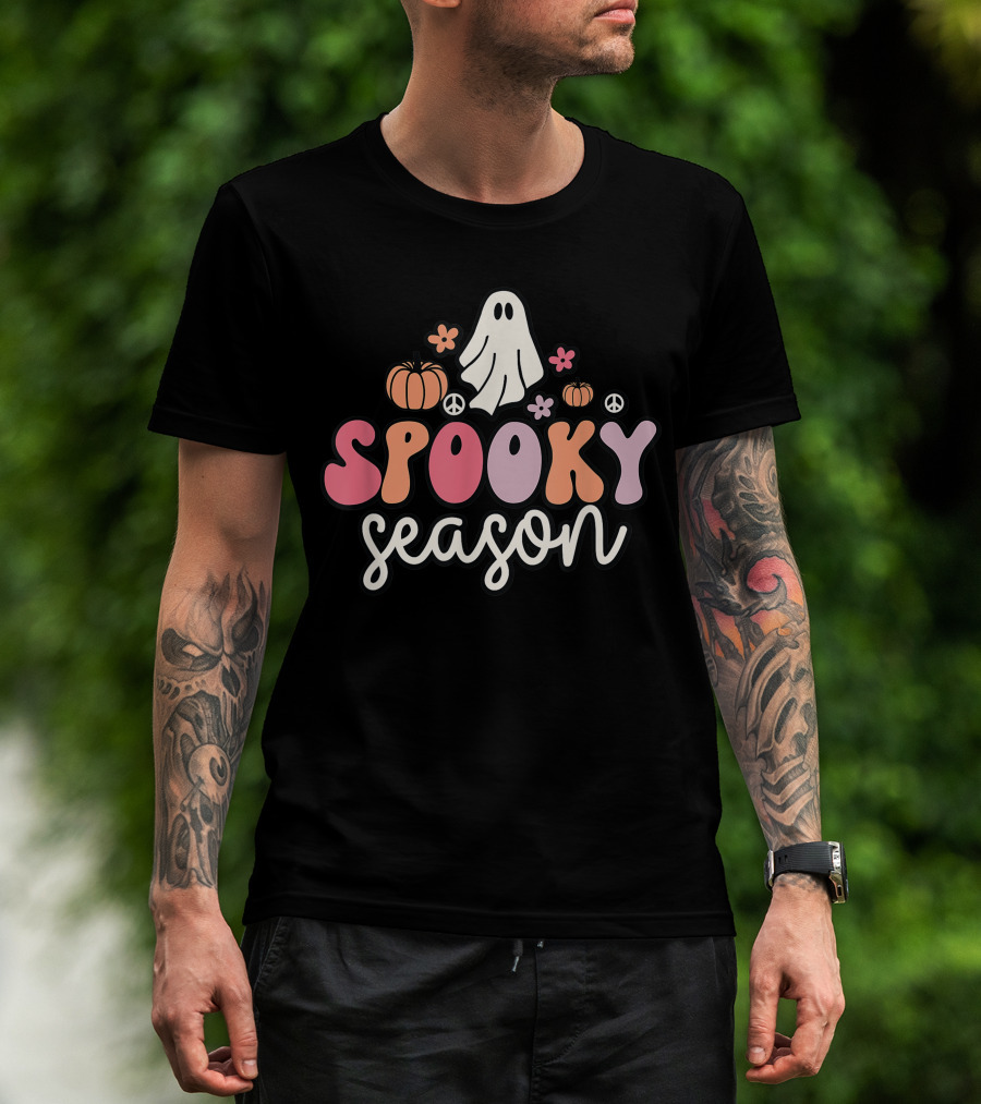 The Groovy Ghost Spooky Season with Pumpkins Peace Flowers T-shirt is designed for everyday wear and a consistent fit. Fabric is pre-shrunk ring-spun cotton with durable stitching. See the size chart below for exact measurements.