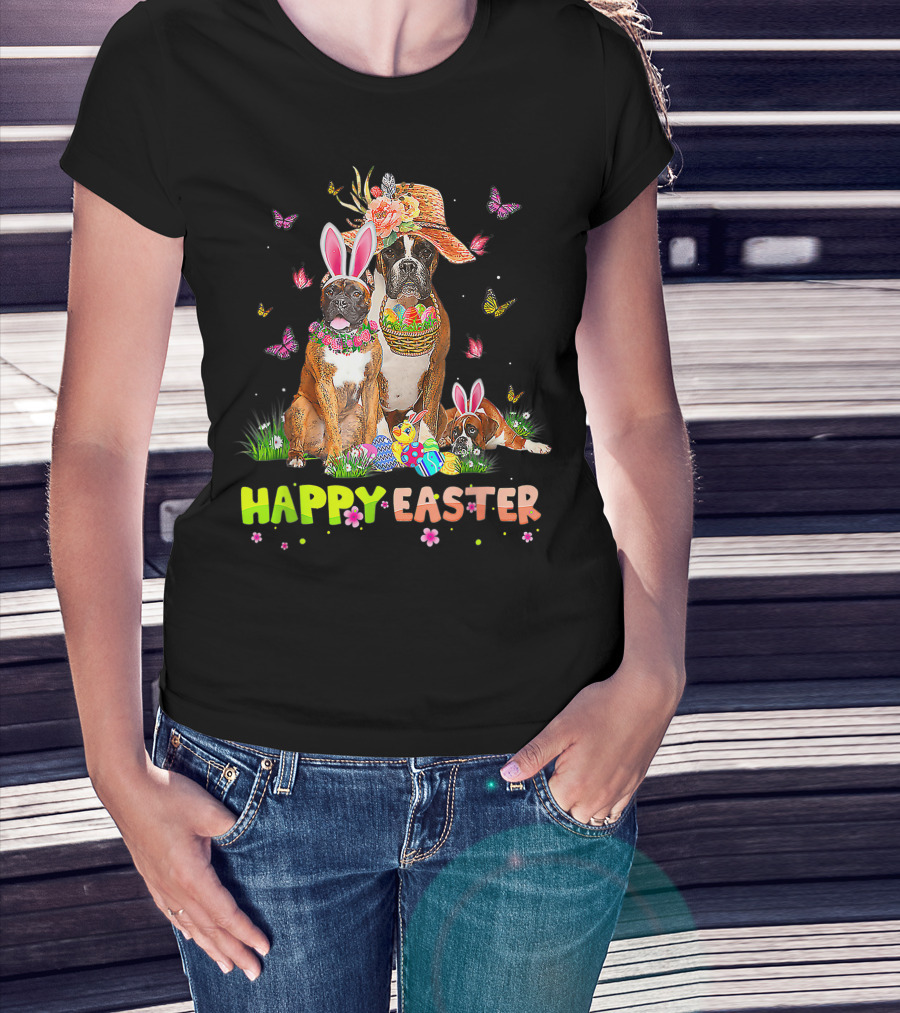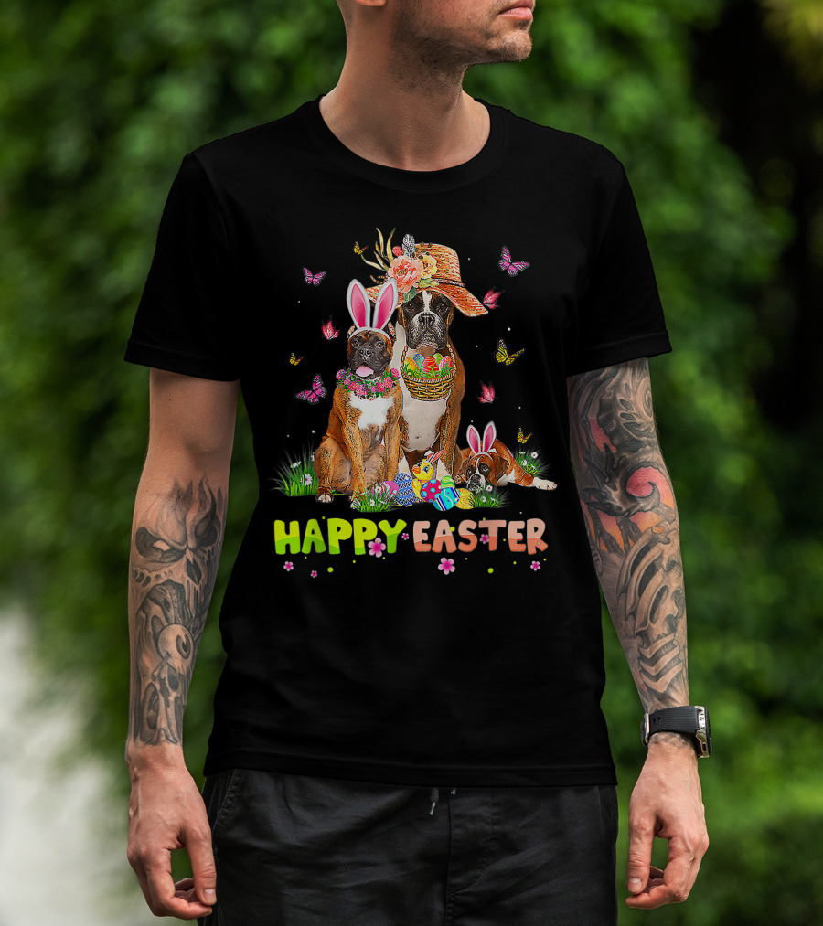 Happy Easter Boxer Dogs Bunny Ears Eggs And Butterflies T-Shirt