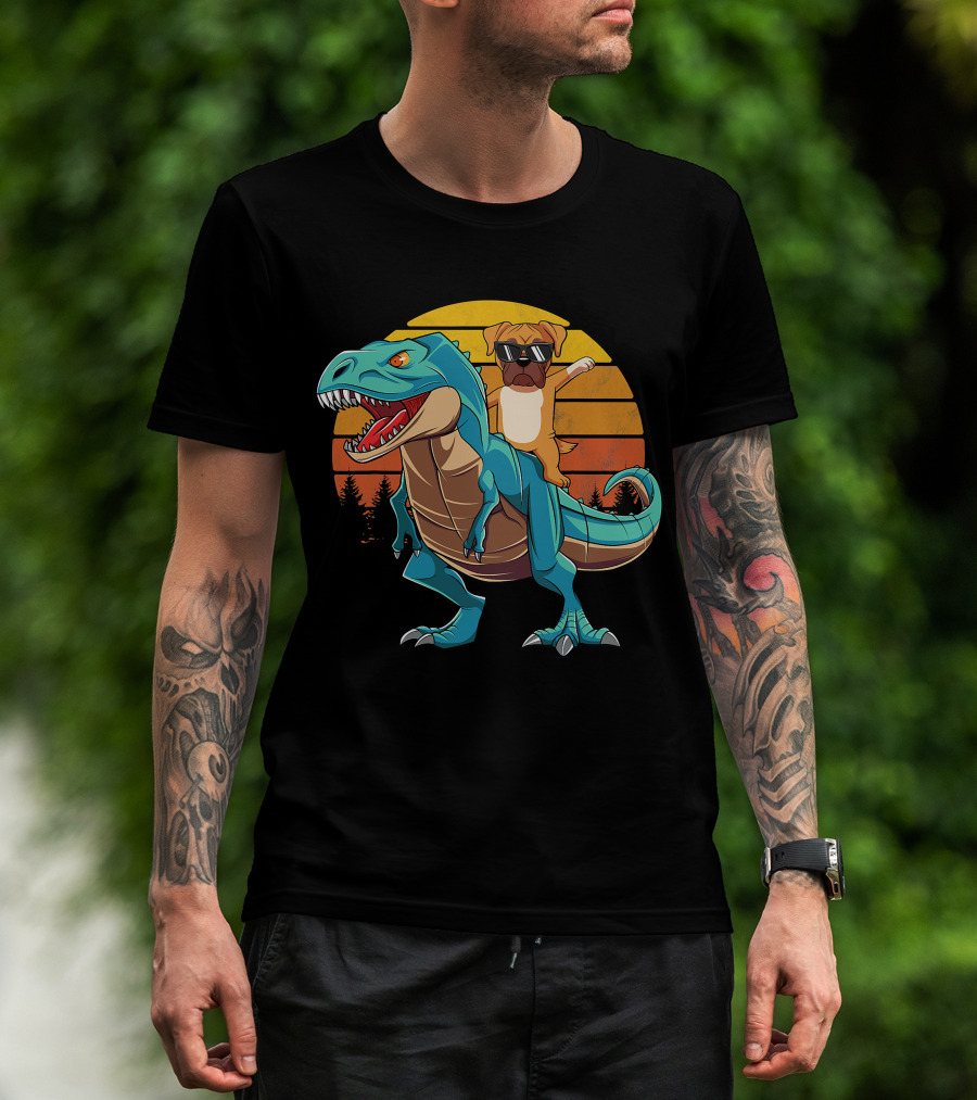 Boxer Dog Riding Dinosaur Rex Boys Girl Sunglasses Sunset T-Shirt
