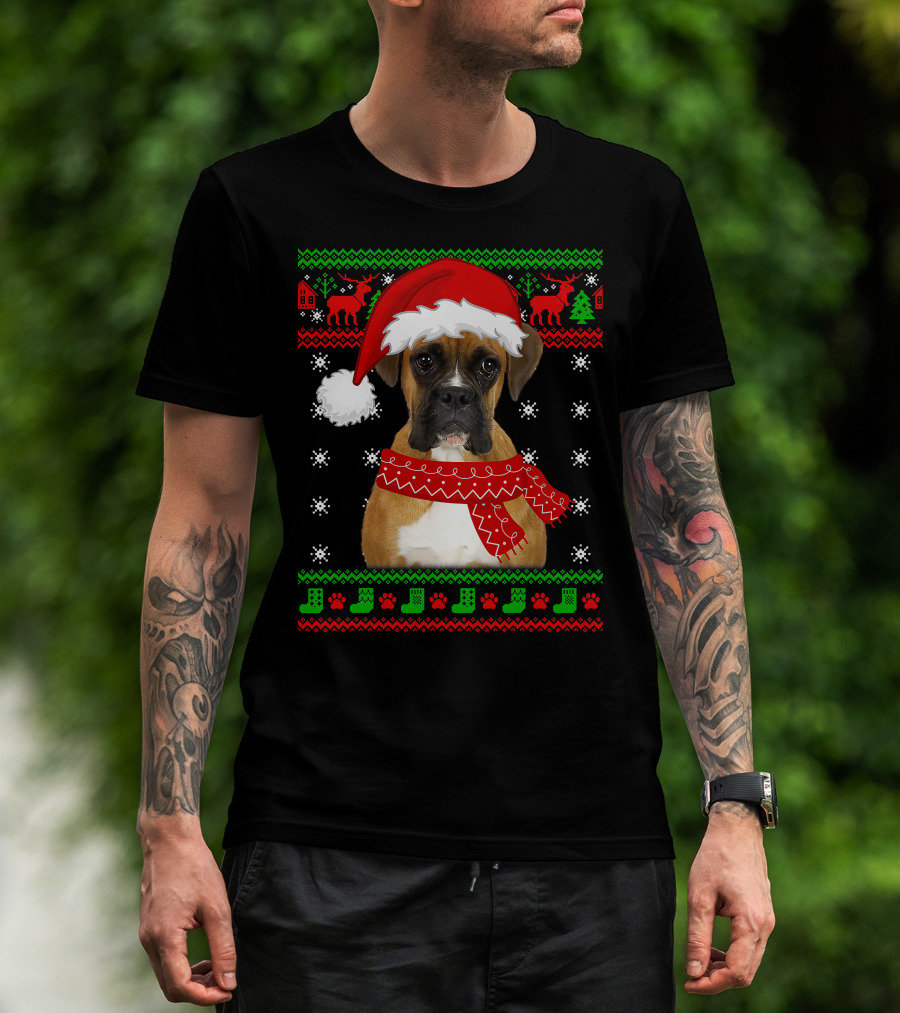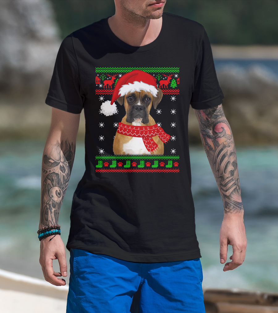 Boxer Dog Christmas Puppy Ugly Sweater Santa Hat Reindeer Snowflakes T-Shirt