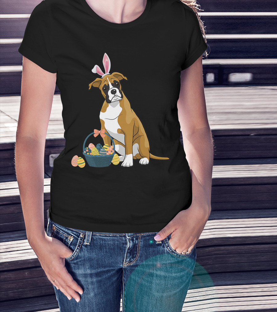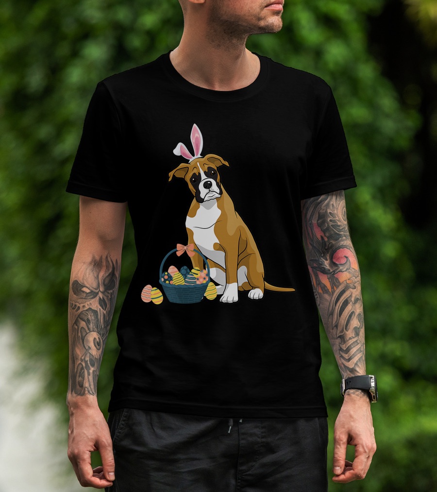 Bunny Ears Boxer Dog Cute Doge Rabbit With Easter Eggs Basket T-Shirt