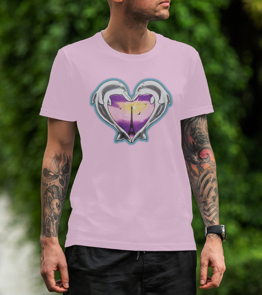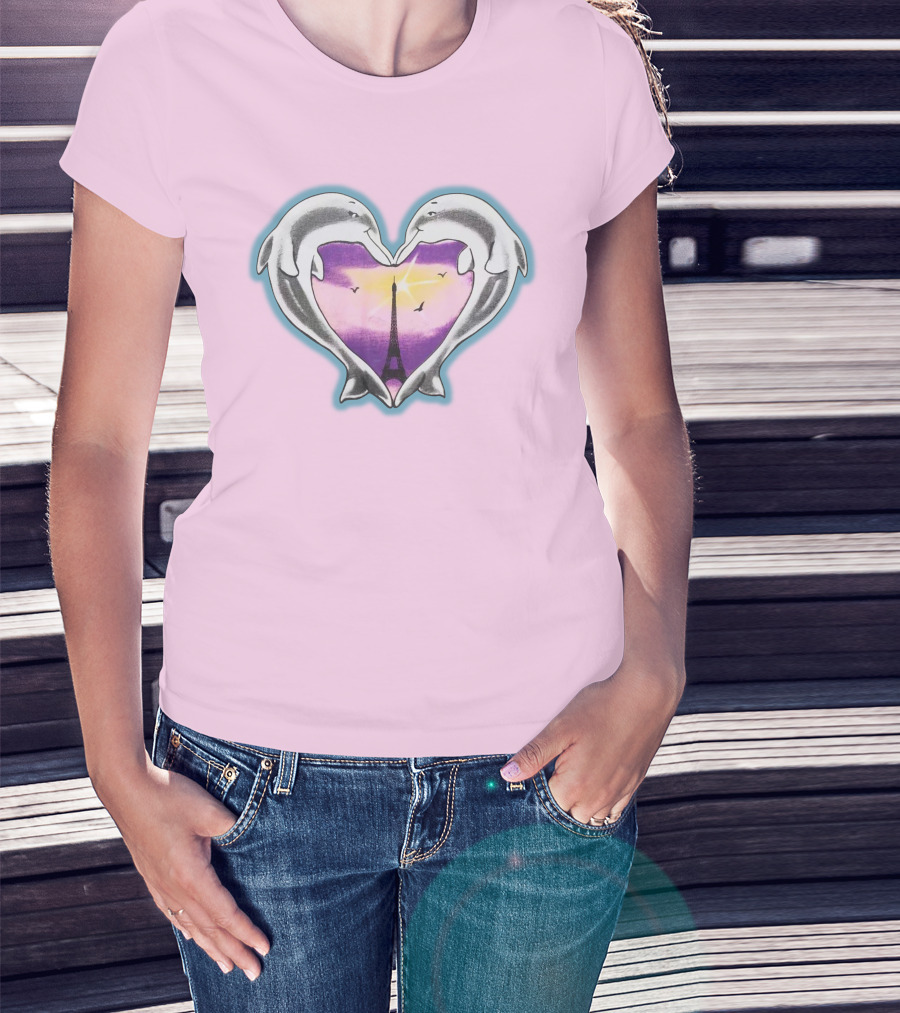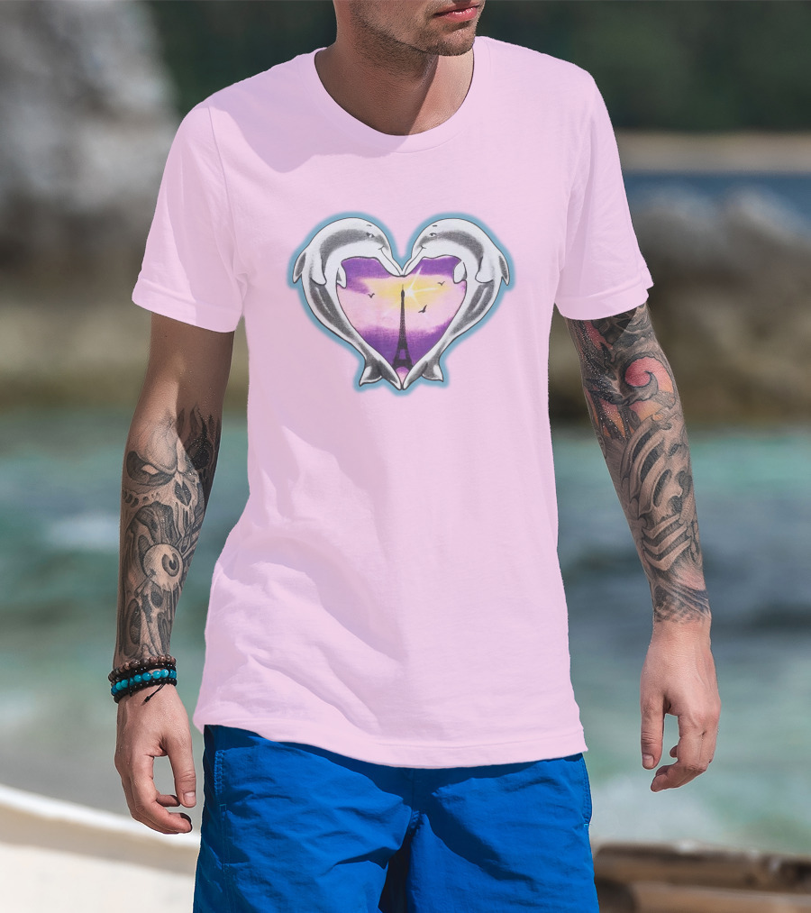 Dolphins Heart Eiffel Tower Sunset Paris Pink Background T-Shirt