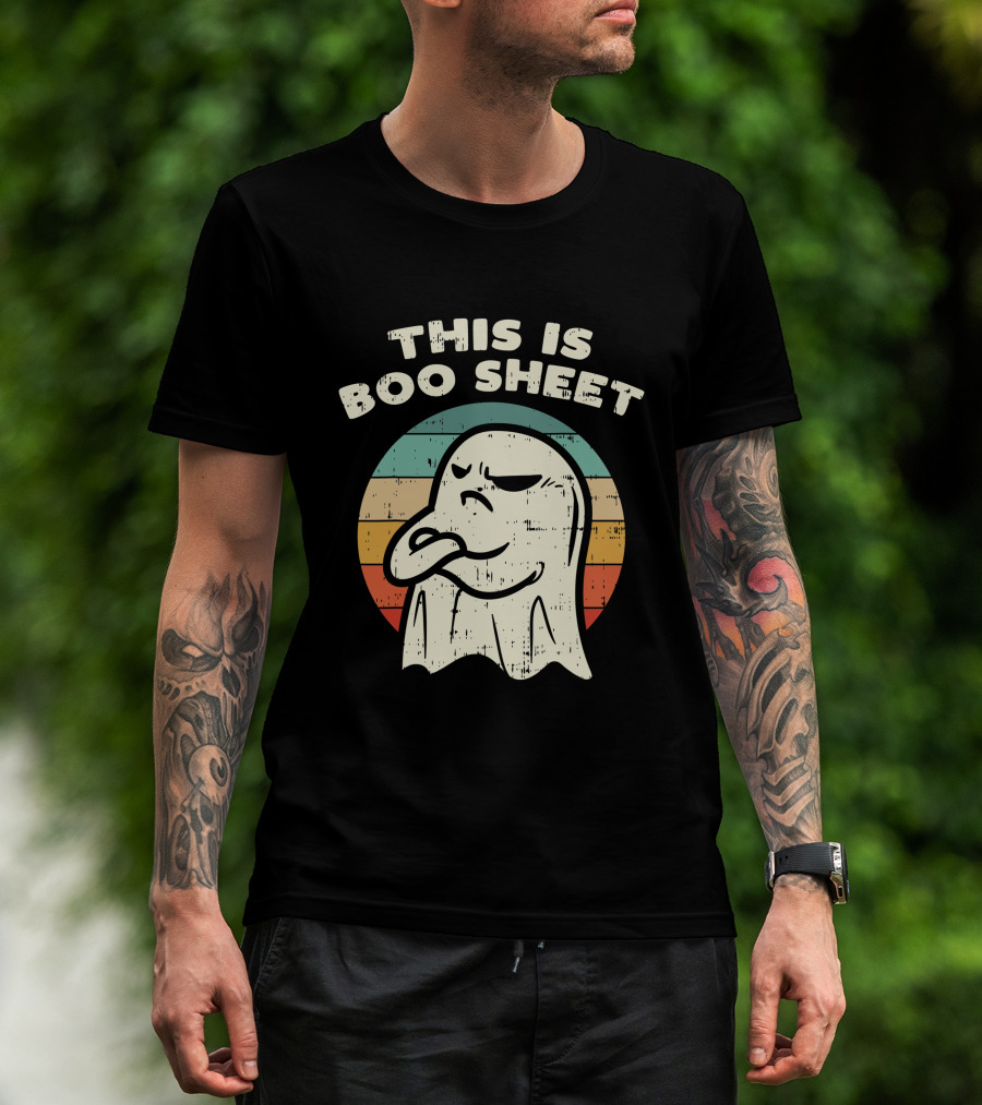 The This Is Boo Sheet Vintage Ghost Halloween Retro Stripes T-shirt is designed for everyday wear and a consistent fit. Fabric is pre-shrunk ring-spun cotton with durable stitching. See the size chart below for exact measurements.