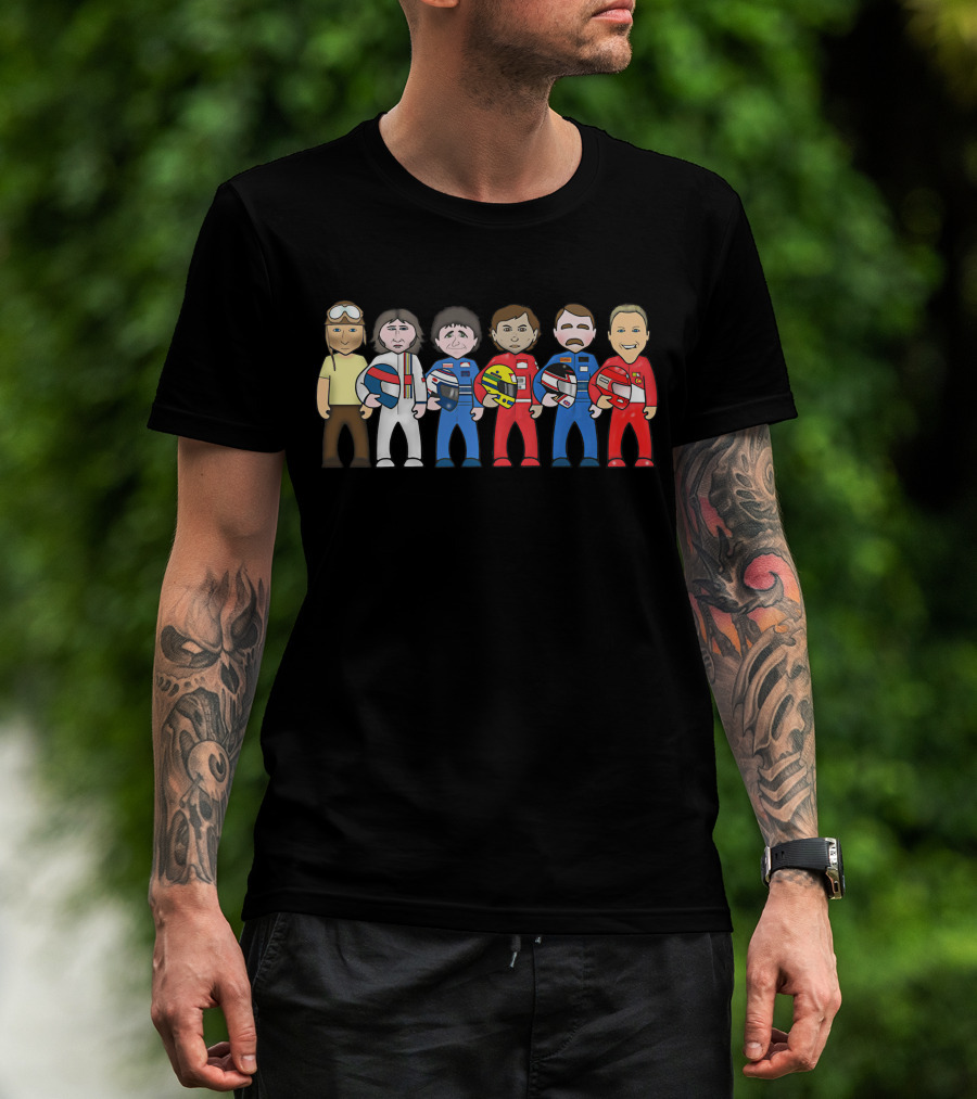 The Ayrton Senna with Legendary F1 Drivers in Iconic Racing Suits T-shirt is designed for everyday wear and a consistent fit. Fabric is pre-shrunk ring-spun cotton with durable stitching. See the size chart below for exact measurements.