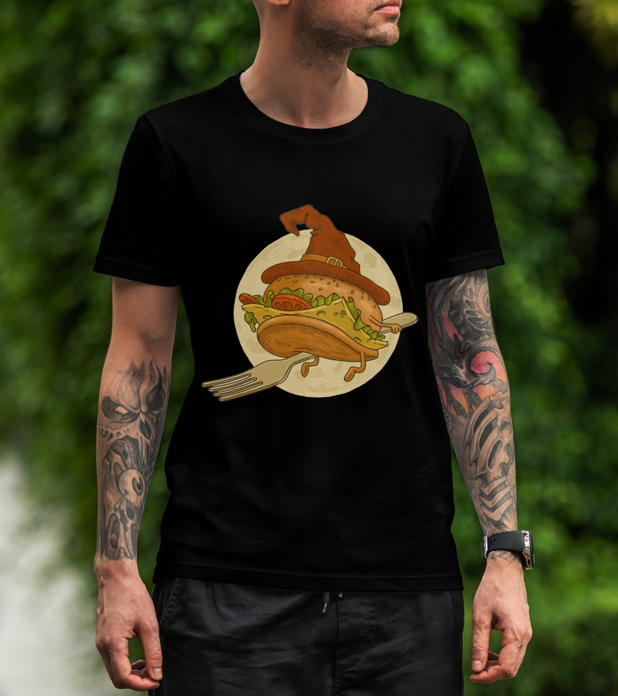 Hamburger With Witch Hat Riding A Fork In Front Of Full Moon T-Shirt