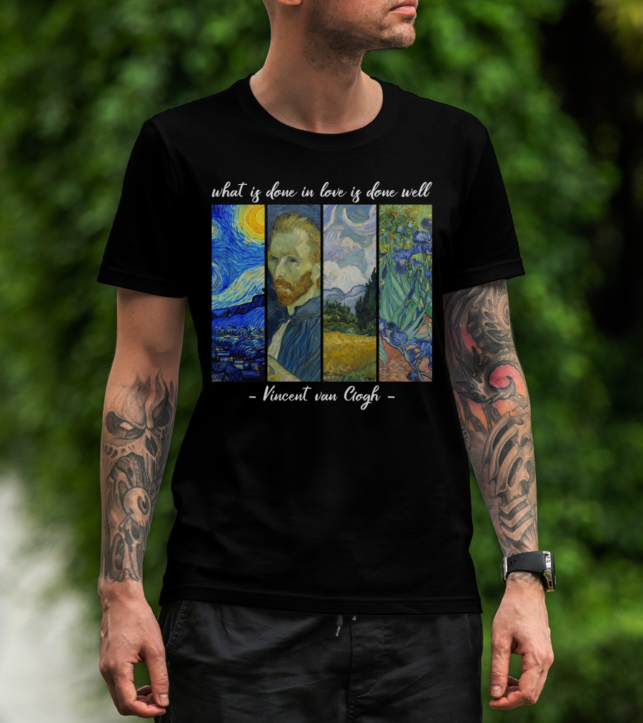 The What Is Done in Love Is Done Well Vincent Van Gogh T-shirt is designed for everyday wear and a consistent fit. Fabric is pre-shrunk ring-spun cotton with durable stitching. See the size chart below for exact measurements.
